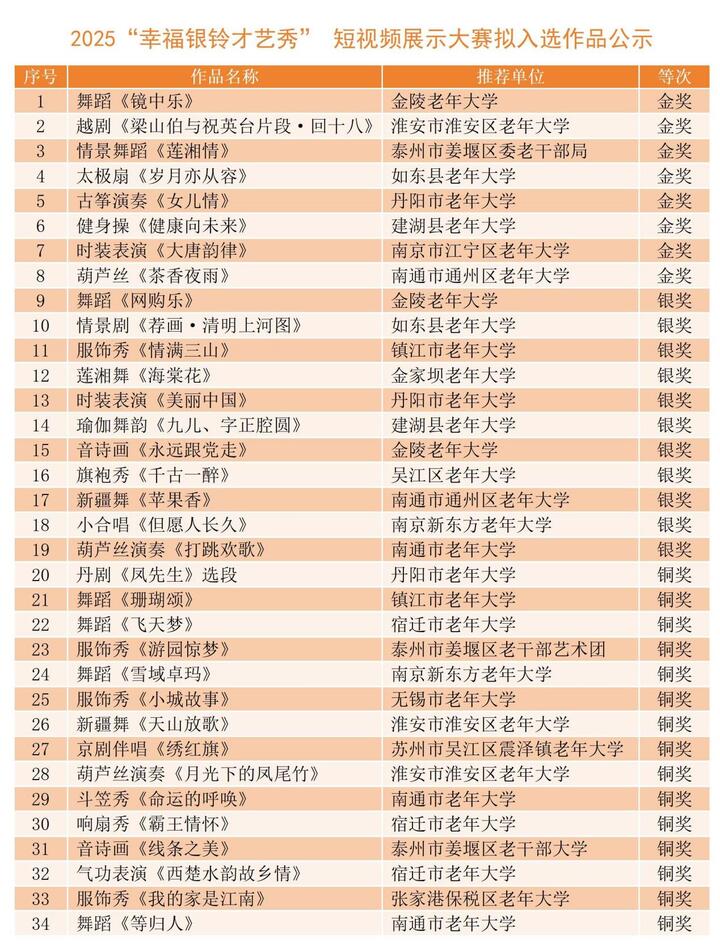 为着力构建老年友好型社会,彰显全省中老年人的多彩才艺与生活热忱,传承弘扬江苏深厚文化底蕴,由江苏省委老干部局、省老龄办指导,江苏省老年大学协会、新华报业·交汇点新闻、中国江苏网共同承办的“幸福银铃才艺秀”短视频展示大赛,自2025年1月2日启动以来,得到全省各级各类老年大学(学校)学员的热烈响应与积极参与。