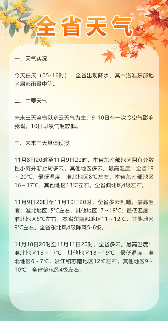 不过冷空气已在路上,9日—10日将有一次冷空气影响江苏,10日早晨气温达近期低点。具体来看,11月8日20时至9日20时,东南部阴有分散性小雨并渐止转多云,其他地区多云,最高温19~20℃,最低温淮北8℃左右、东南部16~17℃、其他地区13℃左右,偏北风4级左右;9日20时至10日20时,全省多云到晴,最高温淮北15℃左右、其他地区17~18℃,最低温淮北5℃左右、东南部11~12℃、其他地区9℃左右,东北风4级阵风5~6级;10日20时至11日20时,全省多云,最高温淮北16~17℃、其他地区18~19℃,最低温淮北6~7℃、沿江和苏南12℃左右、其他地区9~10℃,偏东风4级左右。