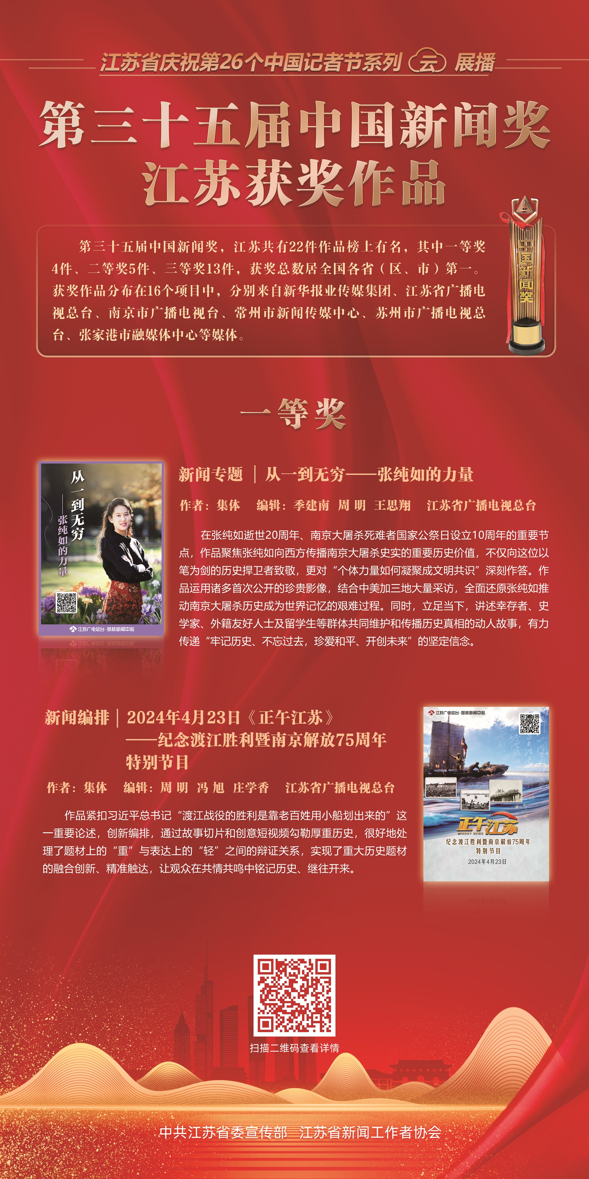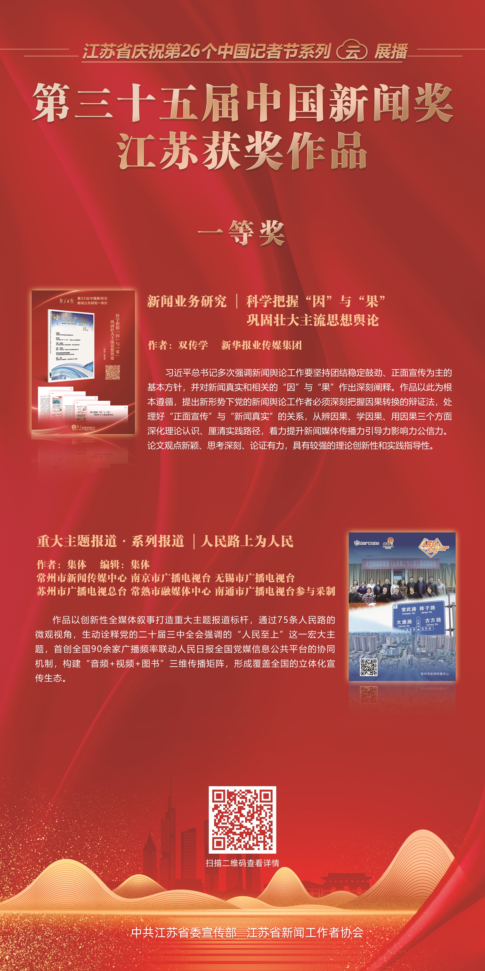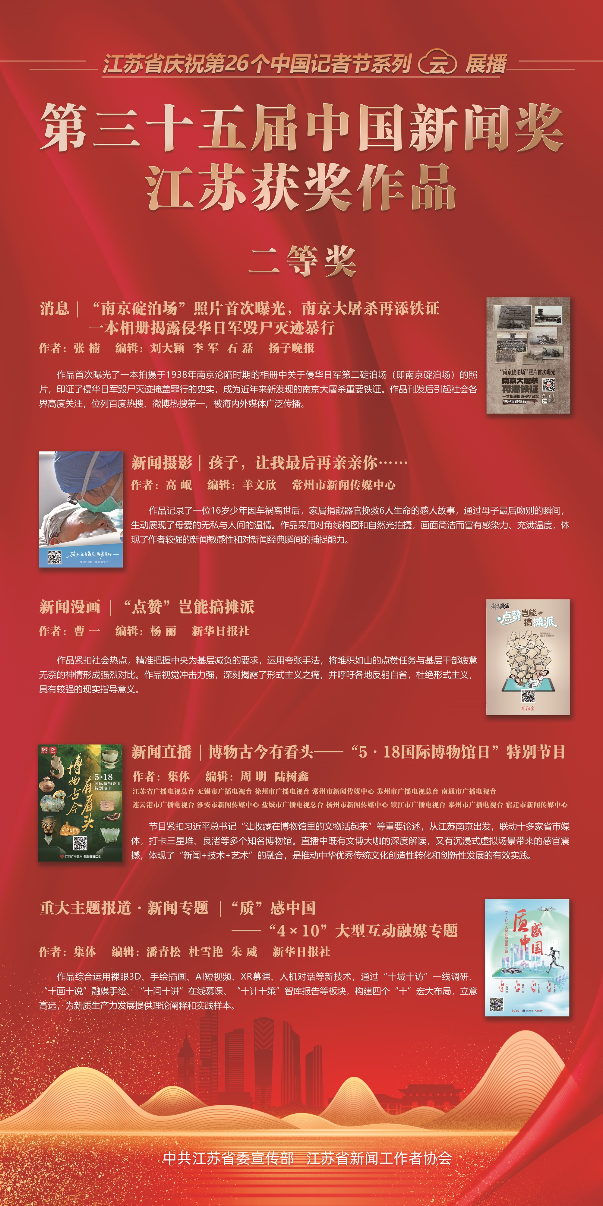 “本次江苏在中国新闻奖上的表现,首要亮点是获奖数量多、门类广。中国新闻奖共设20个类别奖项,江苏最终有22件作品在16个类别上摘得奖项。其中一等奖有4件,比去年多了两件,含金量可以说是相当高。”江苏省记协主席周跃敏指出,新华报业传媒集团和江苏广电总台两大省属媒体发挥“领头羊”与“主力军”作用,分别斩获10个和6个奖项,稳居省级党报、省级广电媒体前列。此外,省内一批市县媒体特别是县级融媒体中心也表现抢眼,展现出基层新闻宣传的蓬勃活力。