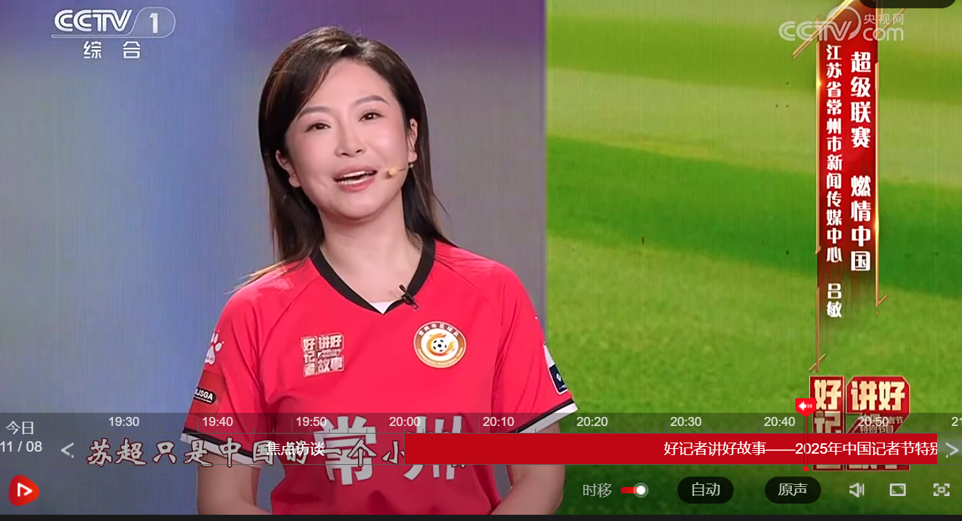 今天是一年一度的记者节。刚刚,常州市新闻传媒中心记者吕敏亮相央视一套《好记者讲好故事——2025年中国记者节特别节目》,此前她凭借其深入报道江苏“苏超”足球联赛的动人故事,荣获“好记者讲好故事”活动“全国十佳选手”称号。