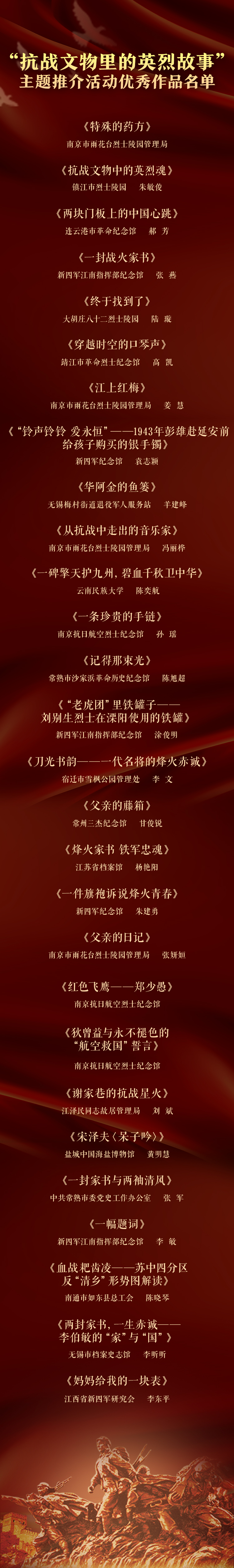 今年是中国人民抗日战争暨世界反法西斯战争胜利80周年,为弘扬伟大抗战精神、缅怀革命先烈,江苏省文物局、江苏省退役军人事务厅、新华日报社联合开展了“抗战文物里的英烈故事”主题推介活动。近日,正式公布了优秀作品名单(具体名单详见海报)。