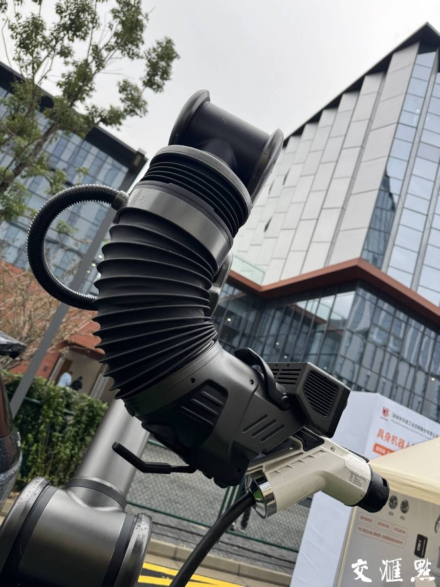 在不远处的万勋科技自动充电机器人演示处,电动汽车驶入车位后,机械臂自动识别车型、定位充电口并完成插拔,全程无需人工干预。该公司研发总监张润智表示,这款机器人专为无人驾驶汽车设计,适配车企、公交场站、无人充电桩等场景,能实现车辆自主预约充电、往返车位的全流程无人化。记者注意到,这款机器人的机械臂有一部分是弯曲的。“弯曲的地方就是机器人的‘柔韧关节’,其能通过轻微变形适配汽车因悬挂下沉、载重变化产生的位置偏差,解决传统刚性机械臂易卡壳、对接失败的问题,兼顾精度与易用性。”张润智解释说。