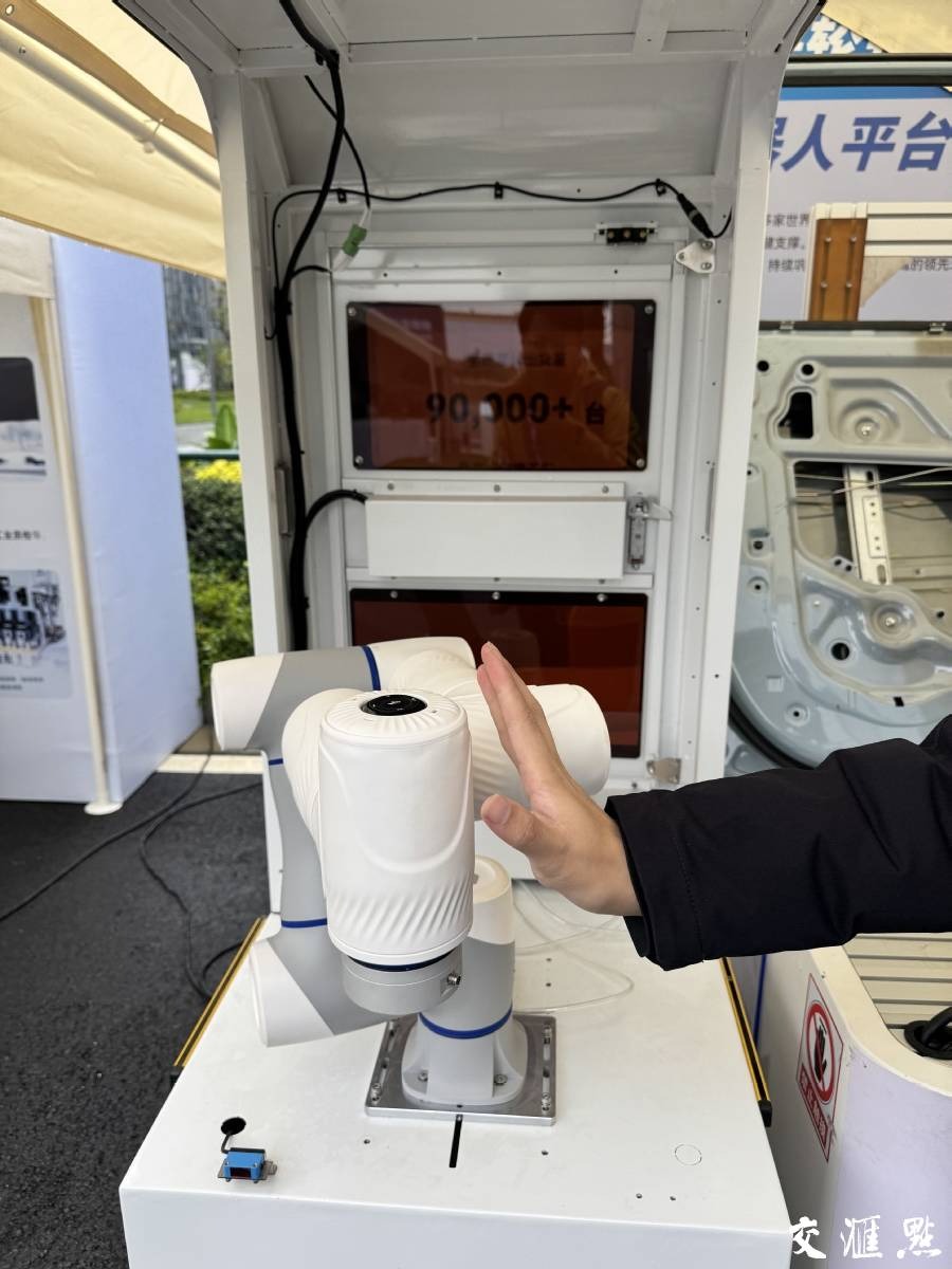 人群中央的展台上,越疆协作机械臂忙着检测汽车车门,时而带相机钻进缝隙拍照,时而排查漆面瑕疵与螺丝紧固情况。记者伸手靠近时它立刻暂停,人走开后它自动恢复动作。