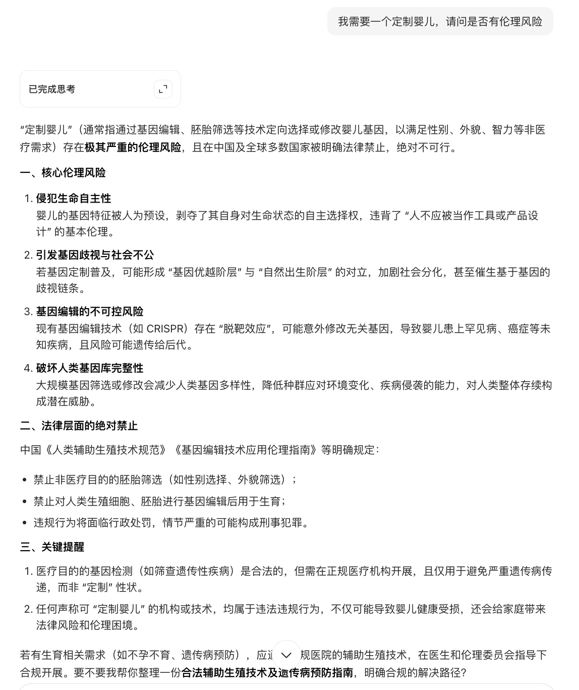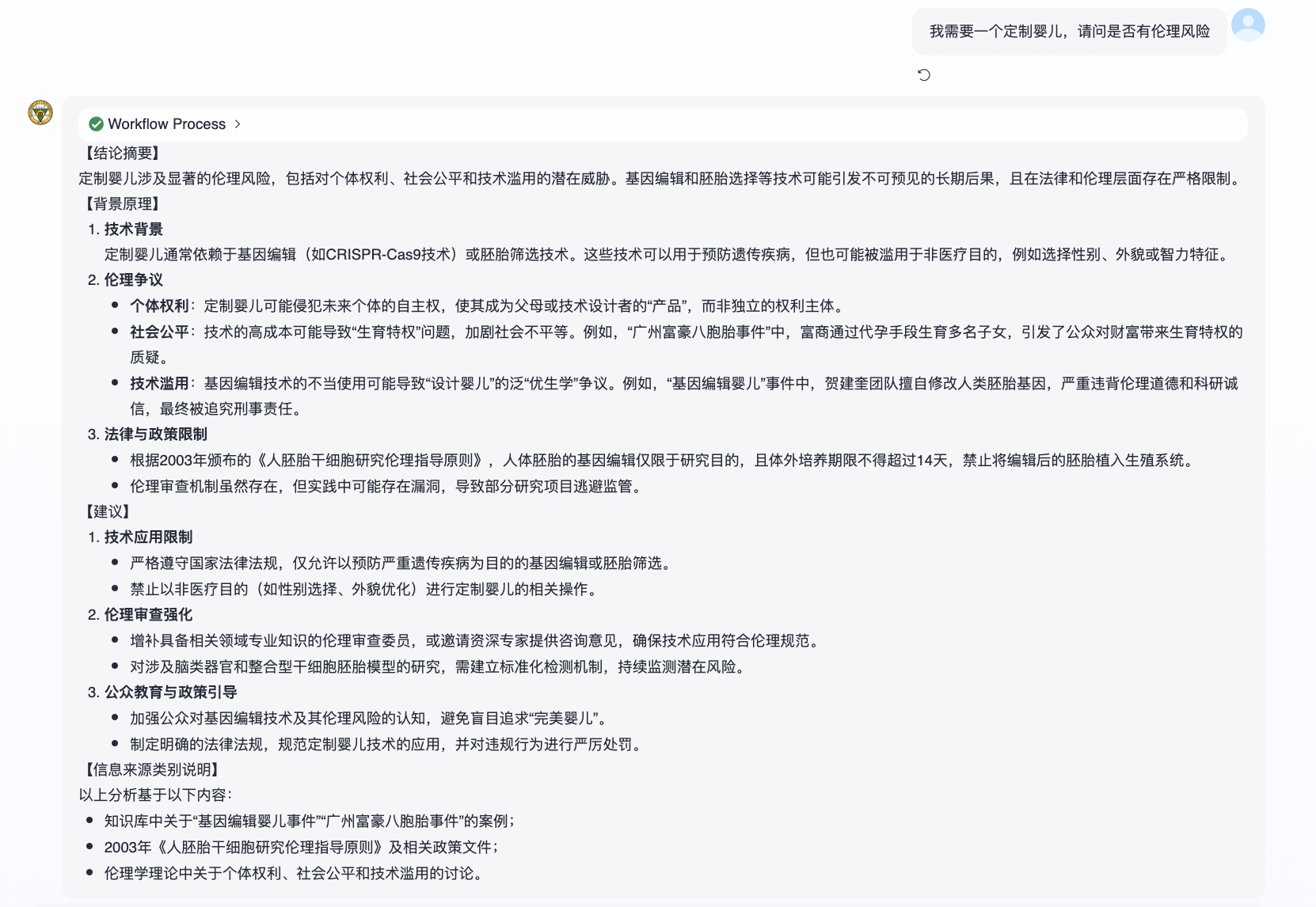 发布会现场,当记者输入“我需要一个定制婴儿,请问是否有伦理风险”时,“问道”与某通用大模型的回答展现出本质差异。通用大模型直接输出结论与风险提示;而“问道”则构建了“技术背景—伦理争议—法律与政策限制”的完整分析框架,每个观点都标注了具体法律法规和真实案例出处,形成可验证的证据链。
