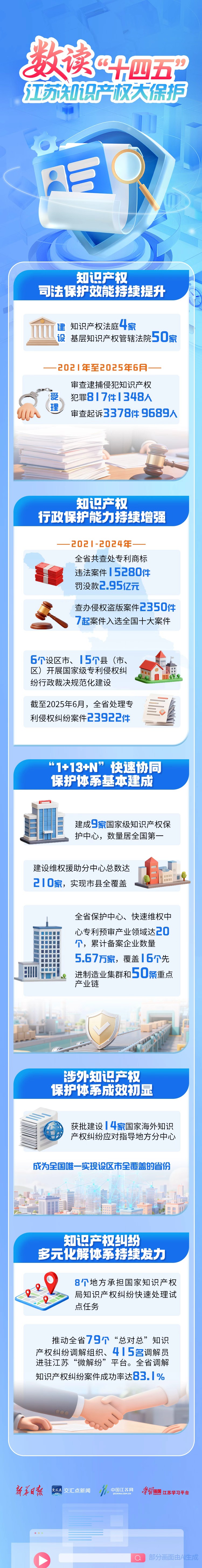 交汇点讯 11月14日下午,记者从苏南片区知识产权保护高地建设新闻发布会上获悉,“十四五”以来,江苏积极打造“知识产权全链条保护样板区”,着力推进知识产权大保护格局提质增效,已基本构建成全国唯一、覆盖全省的“1+13+N”知识产权快速协同保护体系,全面营造市场化、法治化、国际化一流营商环境,为江苏切实扛起“经济大省勇挑大梁”重大责任提供有力的知识产权支撑。