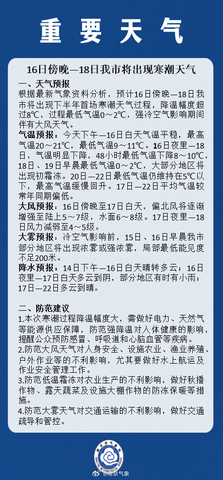 在寒潮到来前,15日、16日早晨南京部分地区将出现浓雾或强浓雾,局部最低能见度不足200米,对交通出行影响显著。气温方面,今天下午至16日白天气温相对平稳,最高气温20~21℃,最低气温9~11℃,但16日夜里起气温将明显下滑,48小时内最低气温下降8~10℃,17日至22日平均气温较常年同期偏低。