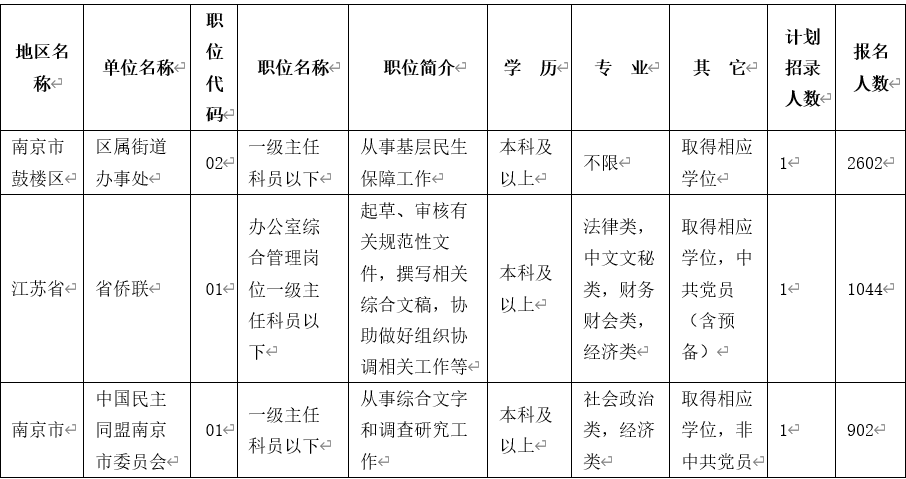 这些岗位对学历要求均为“本科及以上”,专业不限或涵盖类型较为宽泛,“其他要求”覆盖人群较多,工作地点也均为南京,故吸引了众多考生报考。全省报名人数超过500人的岗位有27个,除省级机关外,南京、苏州、扬州、泰州、盐城、宿迁、南通等地区均有涉及,其中南京地区最多,有16个岗位超过500人报考。