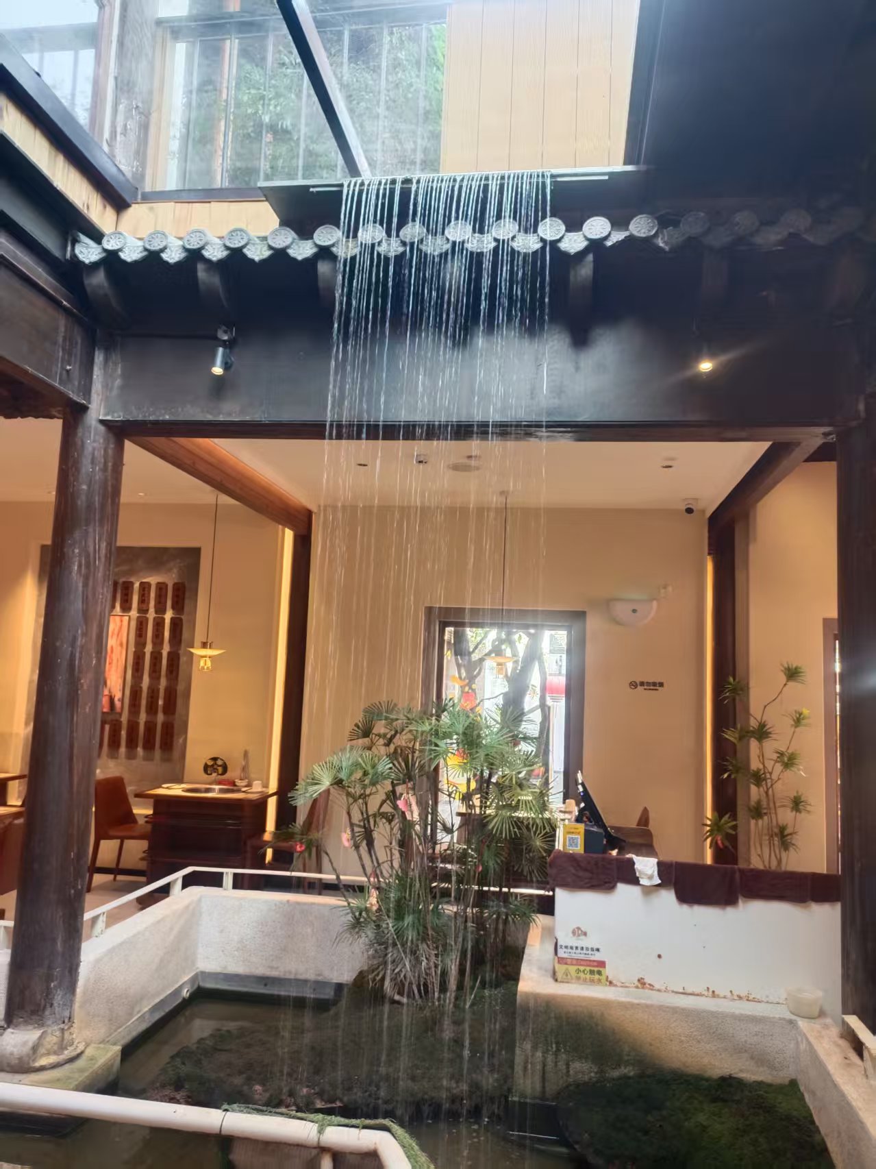 走进南京老门东历史文化街区的大巴山火锅店,古意盎然的天井让人眼前一亮。潺潺流水从屋檐倾泻而下,如银丝般垂落,落入下方的浅池之中。水池里,色彩斑斓的金鱼自在游弋,池边点缀着几株翠绿的植物,为整个空间增添了几分灵动与静谧。古朴的木柱、暖黄的灯光与中式桌椅相映成趣。