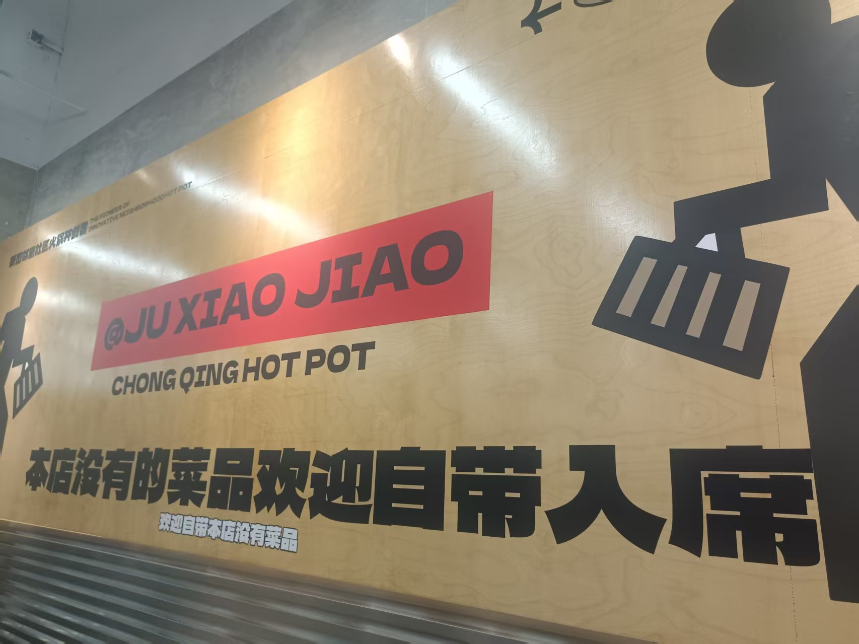 11月13日晚,记者在位于南京秦淮天安数码城一楼的炬小椒重庆老火锅店看到,100多平方米的店面内,11桌餐位已全部坐满。门头及店内墙面写着的告示“本店没有的菜品欢迎自带入席”格外醒目。