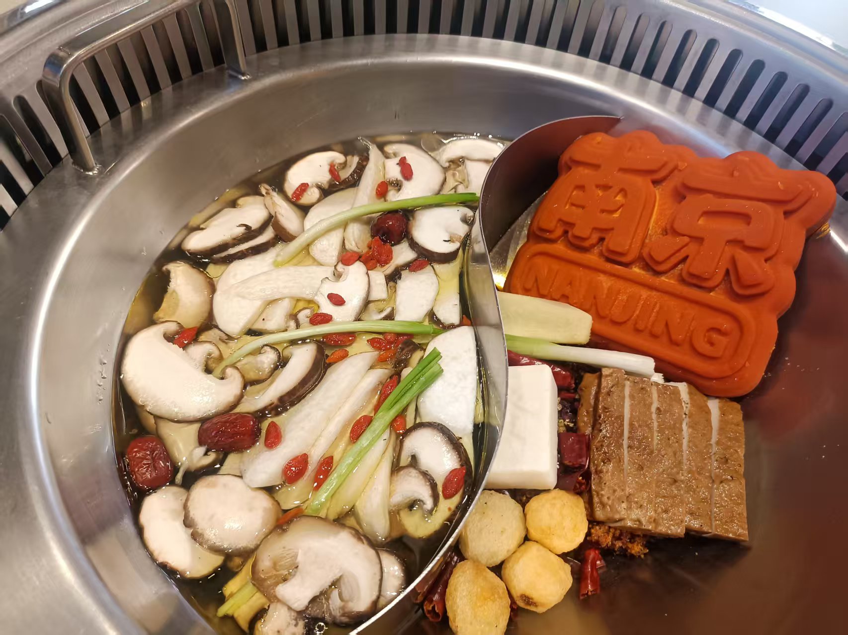 当鸳鸯锅底端上桌,带来兼具味觉与视觉的美好享受。一侧是菌菇荟萃的清汤锅底,多种菌类在清澈汤汁中舒展,还搭配了红枣、枸杞与葱段,鲜醇温润;另一侧则放着豆干、虎皮鹌鹑蛋等丰富食材,尤其特别的是,纯香牛油被精心制成了“南京”字样的造型。