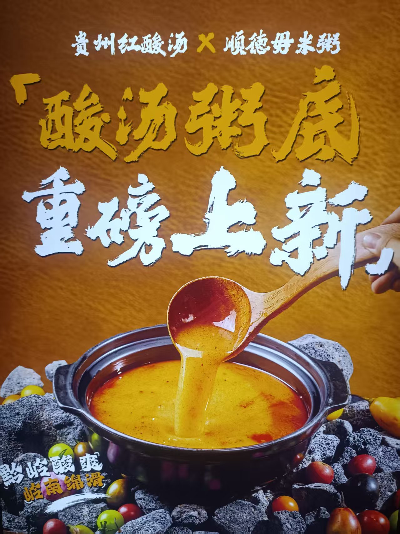 据介绍,毋米粥是源自广东顺德的一项非物质文化遗产,以老鸡搭配药材蒸熬出高汤,再与上等岭南丝苗米、香米反复搅拌熬煮,提炼出“有米不见米,只取米精华”的毋米粥。贵州酸汤源于黔东南苗族、侗族等少数民族的饮食传统,以毛辣果、云南酸木瓜为基底,酸辣爽口。二者交融,岭南粥底温润“作序”,以米精华的绵密锁住食材本味;黔地酸汤鲜辣“点睛”,以酸爽彻底唤醒味感。
