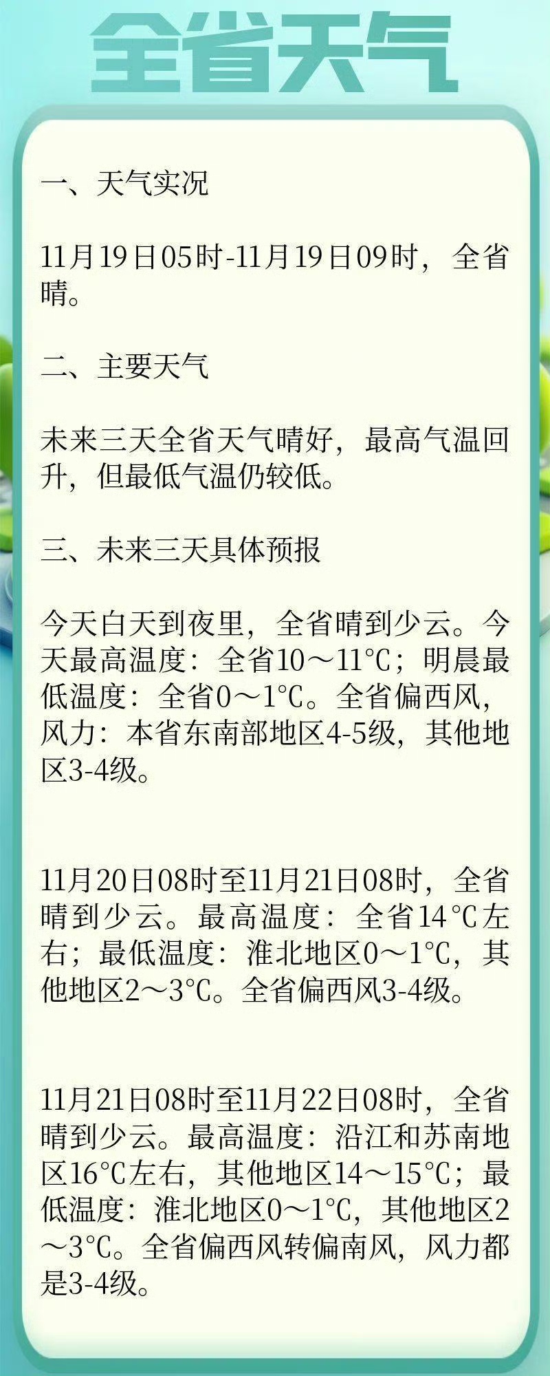 未来三天江苏全省天气晴好,最高气温回升,但最低气温仍较低。今天白天到夜里,全省晴到少云。今天最高温度:全省10~11℃;明晨最低温度:全省0~1℃。全省偏西风,风力:本省东南部地区4~5级,其他地区3~4级。