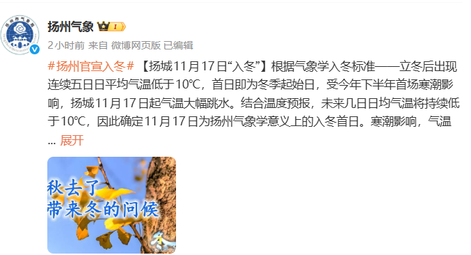 今天,扬州气象表示,扬城11月17日起气温大幅跳水。结合温度预报,未来几日日均气温将持续低于10℃,因此确定11月17日为扬州气象学意义上的入冬首日。