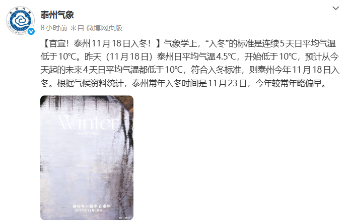 今天,泰州市气象台发布权威消息——泰州11月18日正式入冬啦!