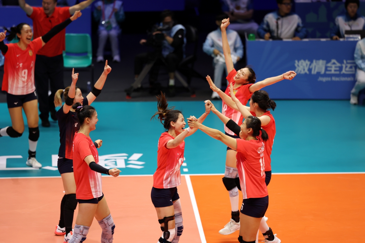 澳门威尼斯人综艺馆内,江苏女排3比0战胜山东队获女子成年组冠军,时隔八年再度站上全运会最高领奖台。
