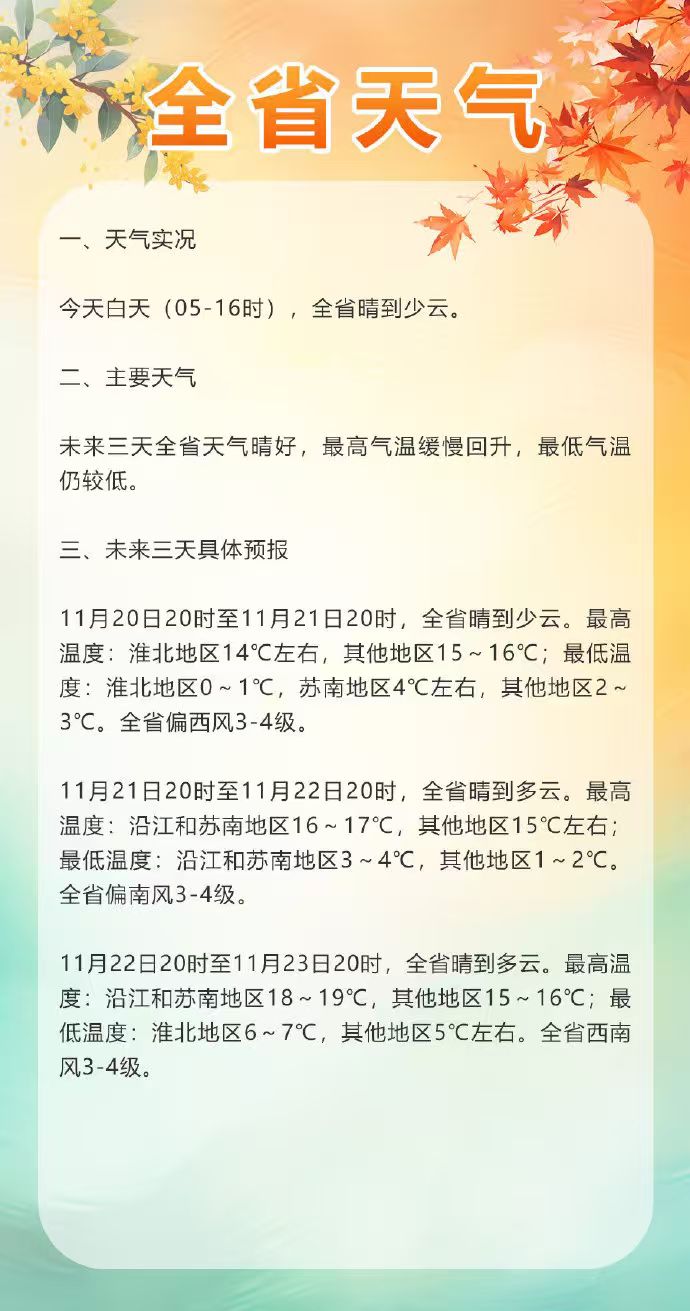 具体来看,11月20日20时至21日20时,全省晴到少云,最高温度淮北地区14℃左右,其他地区15~16℃;最低温度淮北地区0~1℃,苏南地区4℃左右,其他地区2~3℃,偏西风3~4级。11月21日20时至22日20时,全省晴到多云,最高温度沿江和苏南地区16~17℃,其他地区15℃左右;最低温度沿江和苏南地区3~4℃,其他地区1~2℃,偏南风3~4级。11月22日20时至23日20时,全省晴到多云,最高温度沿江和苏南地区18~19℃,其他地区15~16℃;最低温度淮北地区6~7℃,其他地区5℃左右,西南风3~4级。