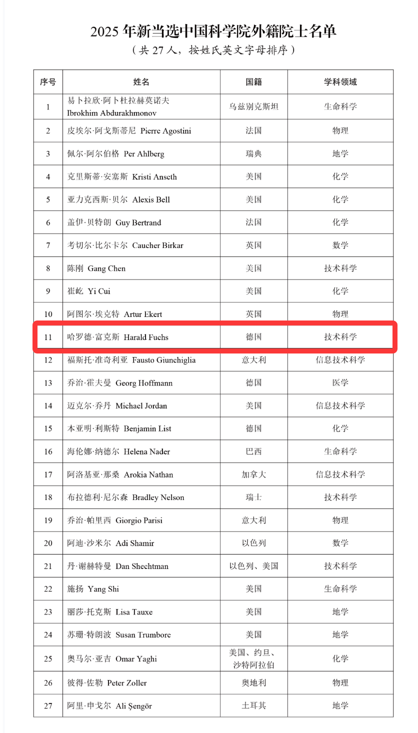 本次江苏当选的1位中国科学院外籍院士为哈罗德·富克斯(Harald Fuchs),学科领域为技术科学。