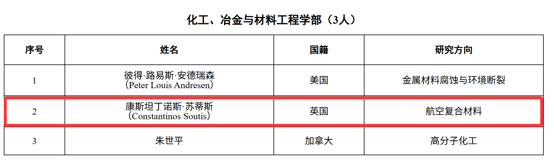 中国工程院外籍院士中,江苏共有4人当选,分别为康斯坦丁诺斯·苏蒂斯,研究方向为航空复合材料;彼得·大卫·路德,研究方向为动力工程及工程热物理;伯恩哈德·沐乐,研究方向为城乡规划与发展;谢亿民,研究方向为结构工程。