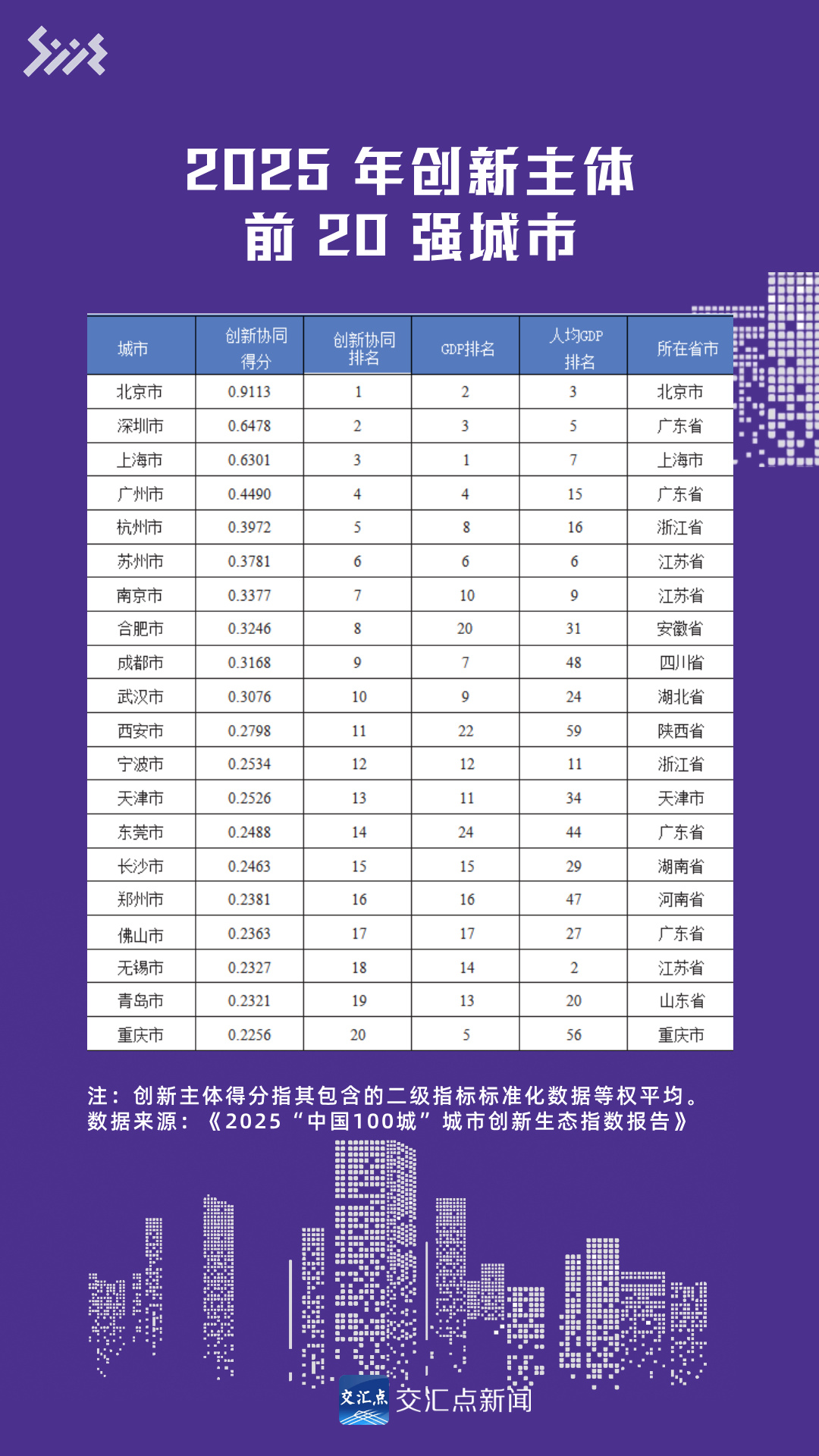 创新主体主要是用于反映围绕技术创新发展进行各项投入产出活动的创新参与者在城市中的表现情况,是评价城市创新发展过程的重要指标。具体指标包含:创新主体规模、创新主体投入和创新主体产出。受“中国100城”城市创新生态指数报告联合研究团队委托,交汇点新闻今日独家发布“中国100城”城市创新主体前20强,苏州、南京和无锡分别位列第六、第七和第十八。