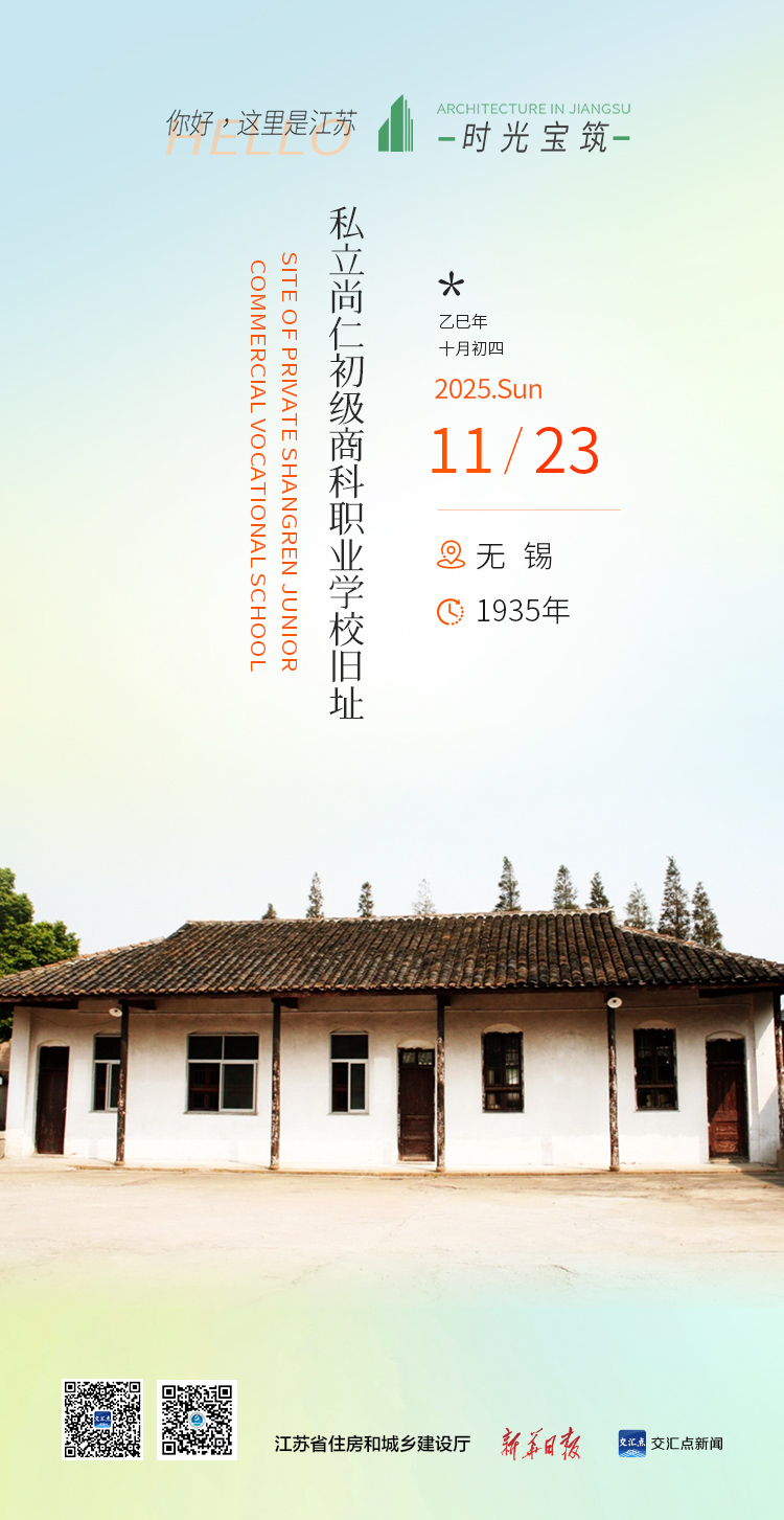 私立尚仁初级商科职业学校旧址位于江阴市青阳镇尚仁路3号,由橡胶工业先驱薛福基于1935年创办,以始迁祖薛尚仁之名命名。校舍共5幢,占地1503平方米,融合中西建筑风格,采用人字梁结构扩大教室空间。作为我国乡村早期职业学校之一,该校曾培养大批橡胶工业骨干,后历经多次更名,现为尚仁小学。