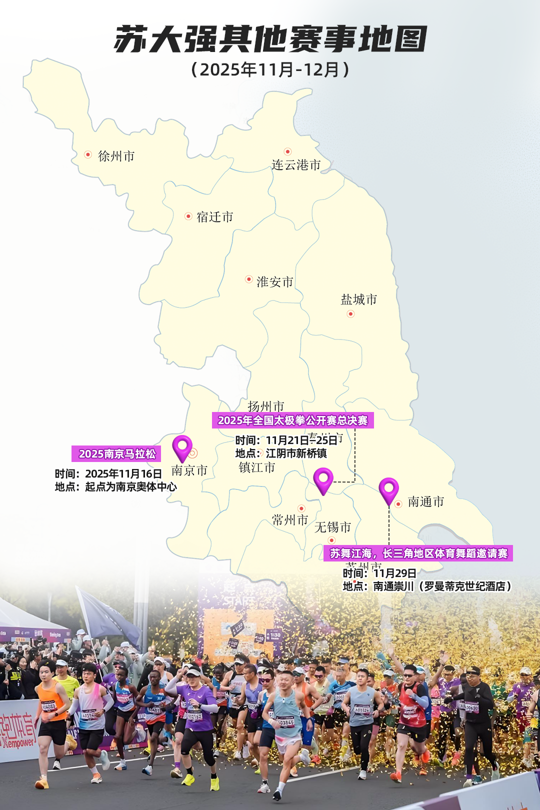 从竞技场的激情呐喊到运河畔的骑行追风,从太湖上的帆船逐浪到山野间的低空飞行……乘着文体旅融合的东风,江苏省文化和旅游厅发布江苏赛事旅游地图(2025年11月—12月),用精彩赛事串联起好山好水,为游客解锁“心跳加速+诗意栖息”的双重体验。