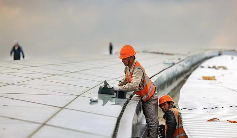 “金属屋面工程融合多项先进技术与材料,能显著提升屋面整体性能和使用寿命。”中建八局扬泰机场项目经理丁家伟介绍,目前航站楼玻璃幕墙施工已完成近八成,内部装修与机电安装同步推进,计划年底前完成主要装修及机电安装任务,外立面幕墙、民航工程及配套高架桥将同步竣工。