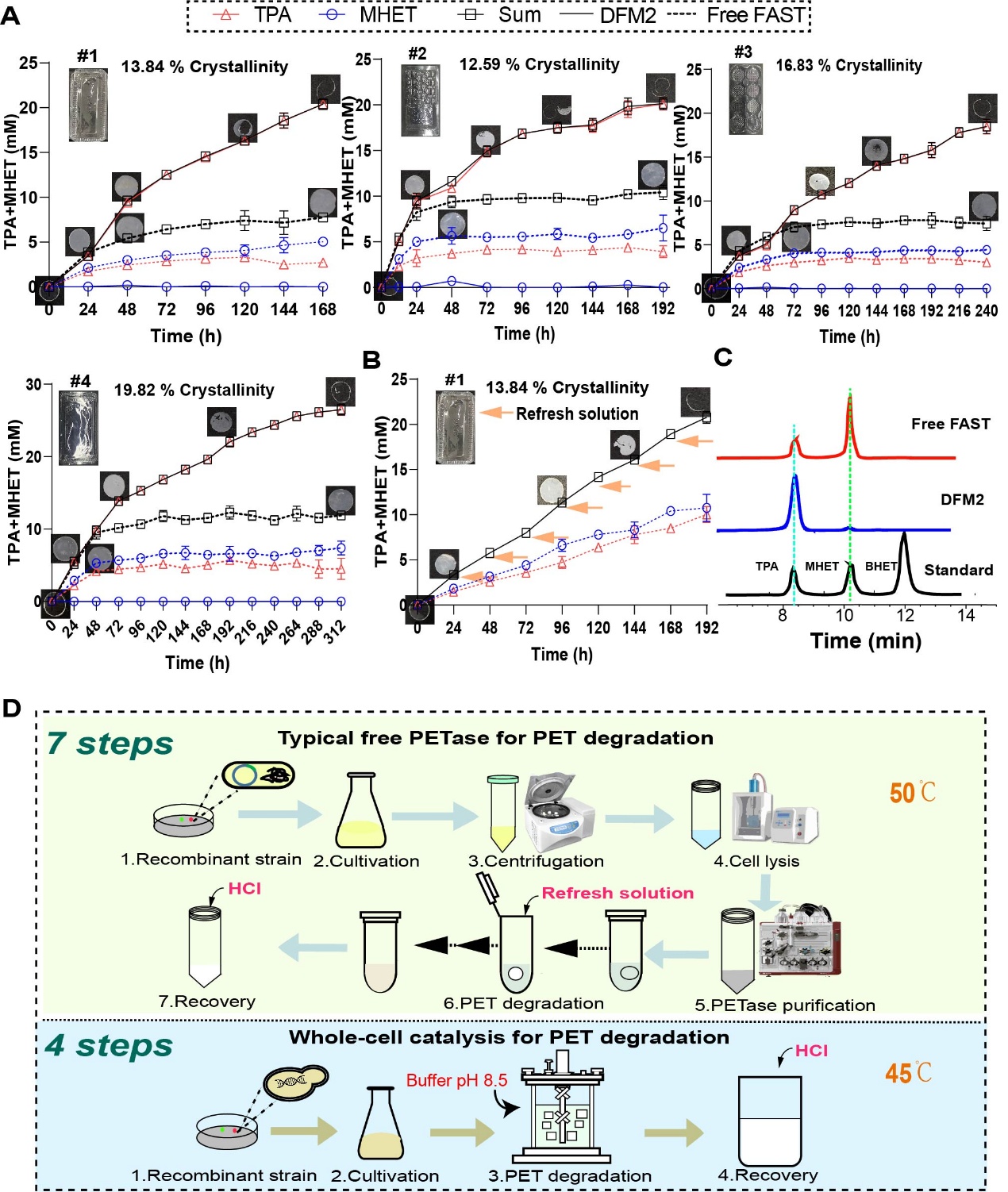 与传统的使用提纯酶的方法相比,这种全细胞“活体催化剂”展现出了许多优势,整个降解过程只需一次性投入工程酵母,大大简化了流程,降低了成本,并且可以重复使用。在放大实验中,研究人员在5升的生物反应器中投入20克普通的废弃塑料瓶碎片,在仅控制酸碱度的温和条件下,这些塑料在一周内被完全分解为了塑料单体。