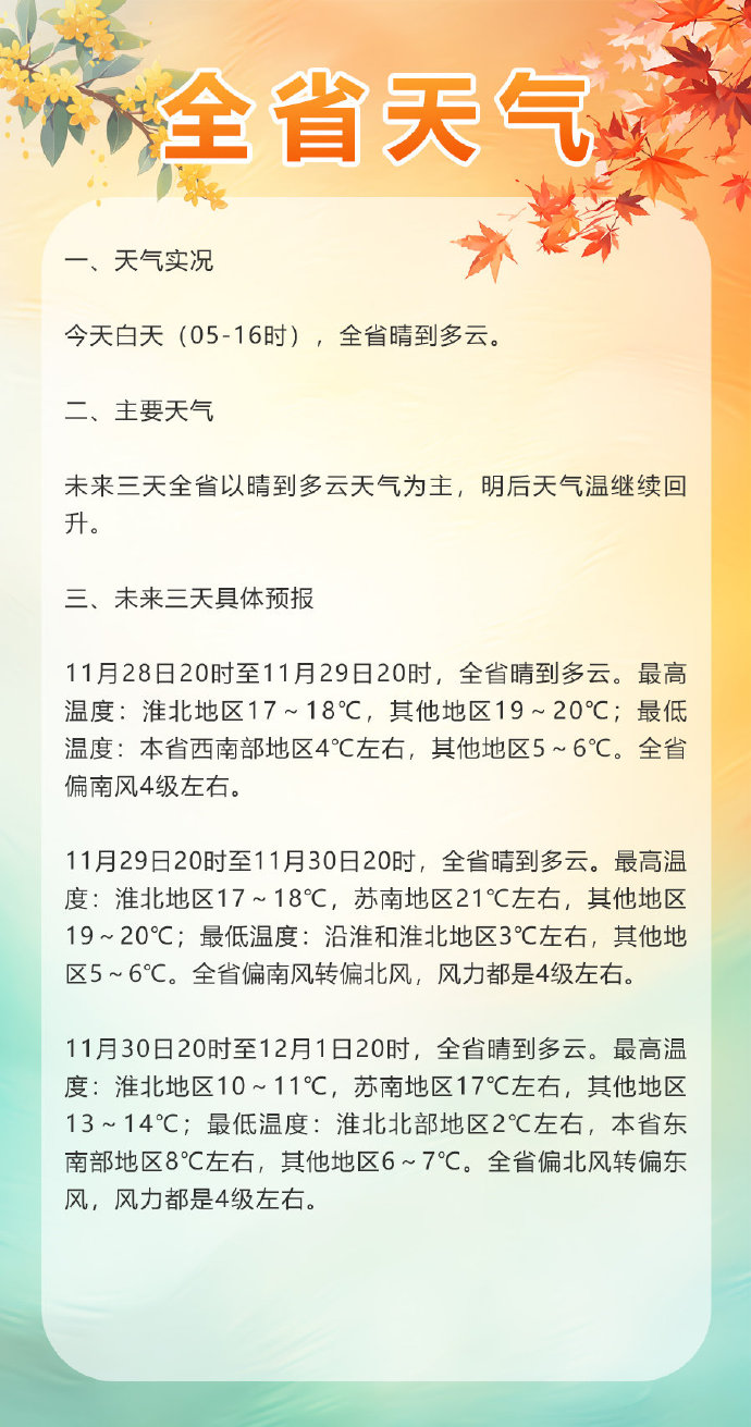 具体预报如下:11月28日20时至11月29日20时,全省晴到多云,最高温度淮北地区17~18℃,其他地区19~20℃,最低温度本省西南部地区4℃左右,其他地区5~6℃,全省偏南风4级左右;11月29日20时至11月30日20时,全省晴到多云,最高温度淮北地区17~18℃,苏南地区21℃左右,其他地区19~20℃,最低温度沿淮和淮北地区3℃左右,其他地区5~6℃,全省偏南风转偏北风,风力都是4级左右;11月30日20时至12月1日20时,全省晴到多云,最高温度淮北地区10~11℃,苏南地区17℃左右,其他地区13~14℃,最低温度淮北北部地区2℃左右,本省东南部地区8℃左右,其他地区6~7℃,全省偏北风转偏东风,风力都是4级左右。