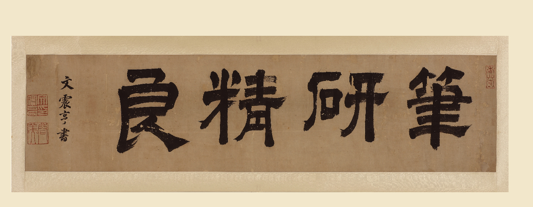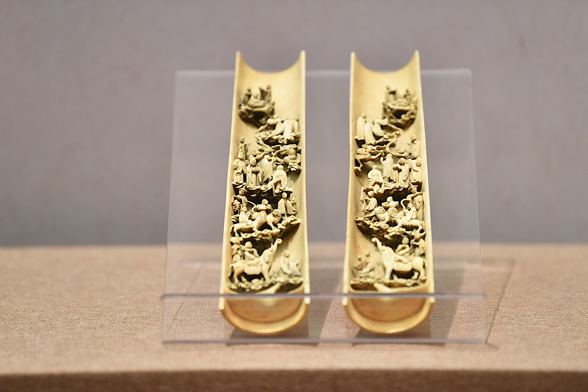 笔墨纸砚是文人读书绘画不可或缺的用具。明清时期,江南地区文房用具种类之繁多、功能之精细,达到前所未有的高峰。“笔砚精良”部分展出的明末文人文震亨隶书横幅“笔砚精良”真迹(无锡博物院藏)引人注目。文震亨是文徵明后裔,多才多艺,风雅绝伦。他的代表作《长物志》分室庐、花木、水石、禽鱼等十二卷,生动记录明朝江南文人的生活情趣。在该单元,观众还能看到清代东山报捷竹刻笔筒、清代白玉螭虎书镇、清“鹿原”款端砚等精品文物。无锡博物院所藏“清哥釉叶形瓷笔舔”也是一件特殊文物。任宝龙告诉记者,笔舔主要用于毛笔蘸墨后抹匀笔尖余墨,名字就很形象传神,是清代文具小九件之一。