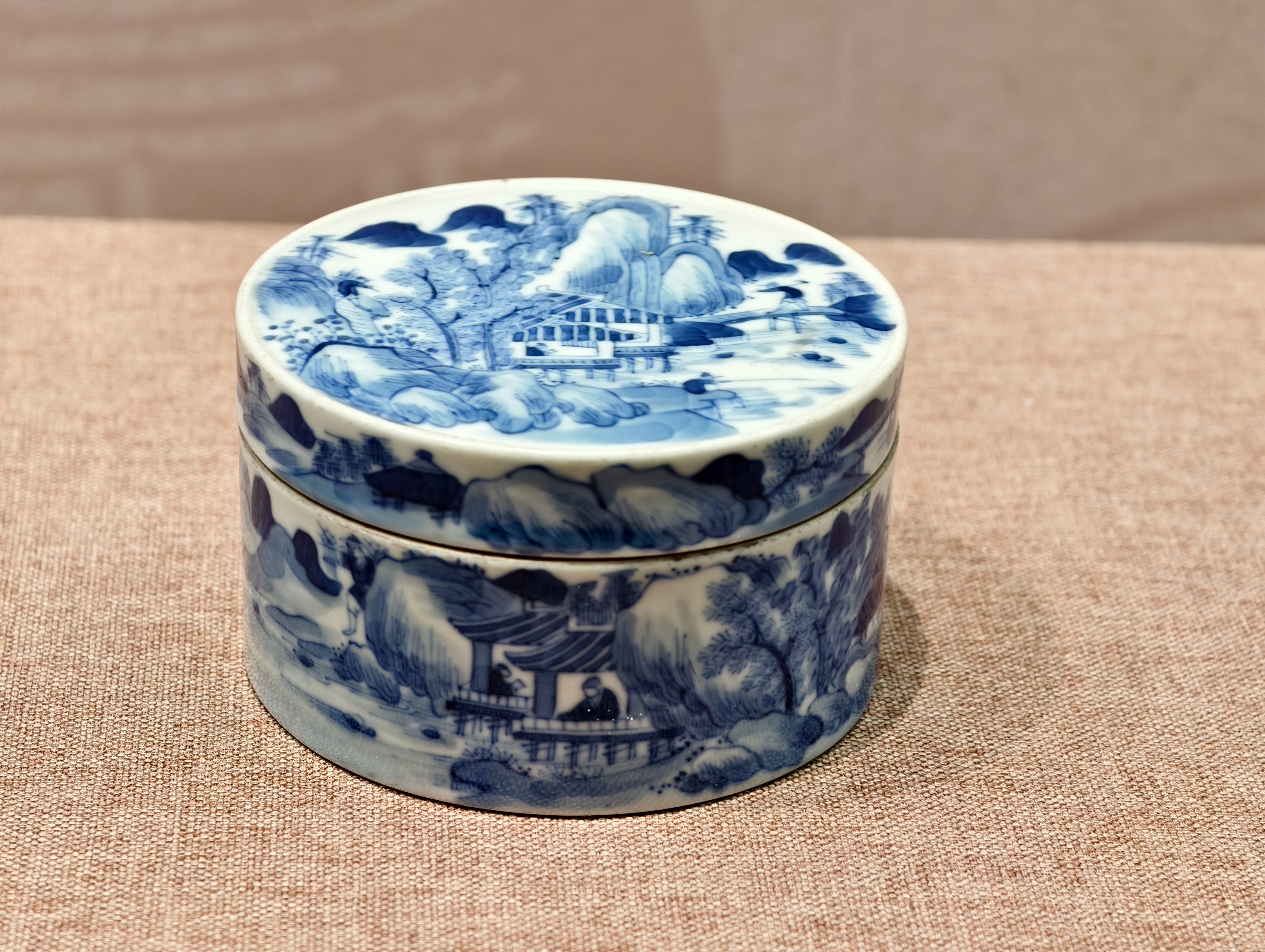 “金石为友”单元力图通过金石文物,展现江南文人的“精神世界”。明麒麟形青铜摆件、清代松鹿山水人物纹三镶青玉如意、清饕餮纹铜鼎等精品都是记录明清江南文人艺术成就的生动载体。无锡博物院收藏的“‘蕴藏美记’款青花渔樵耕读图瓷印盒”,寄托着江南文人对田园生活的向往和对淡泊名利的追求。印盒主题纹饰为“渔樵耕读”图,由渔夫、樵夫、农夫和书生四个形象组成,纹饰采用全景式构图,远山近水,树木亭台,人物活动其间,形成完整的山水人物画卷。