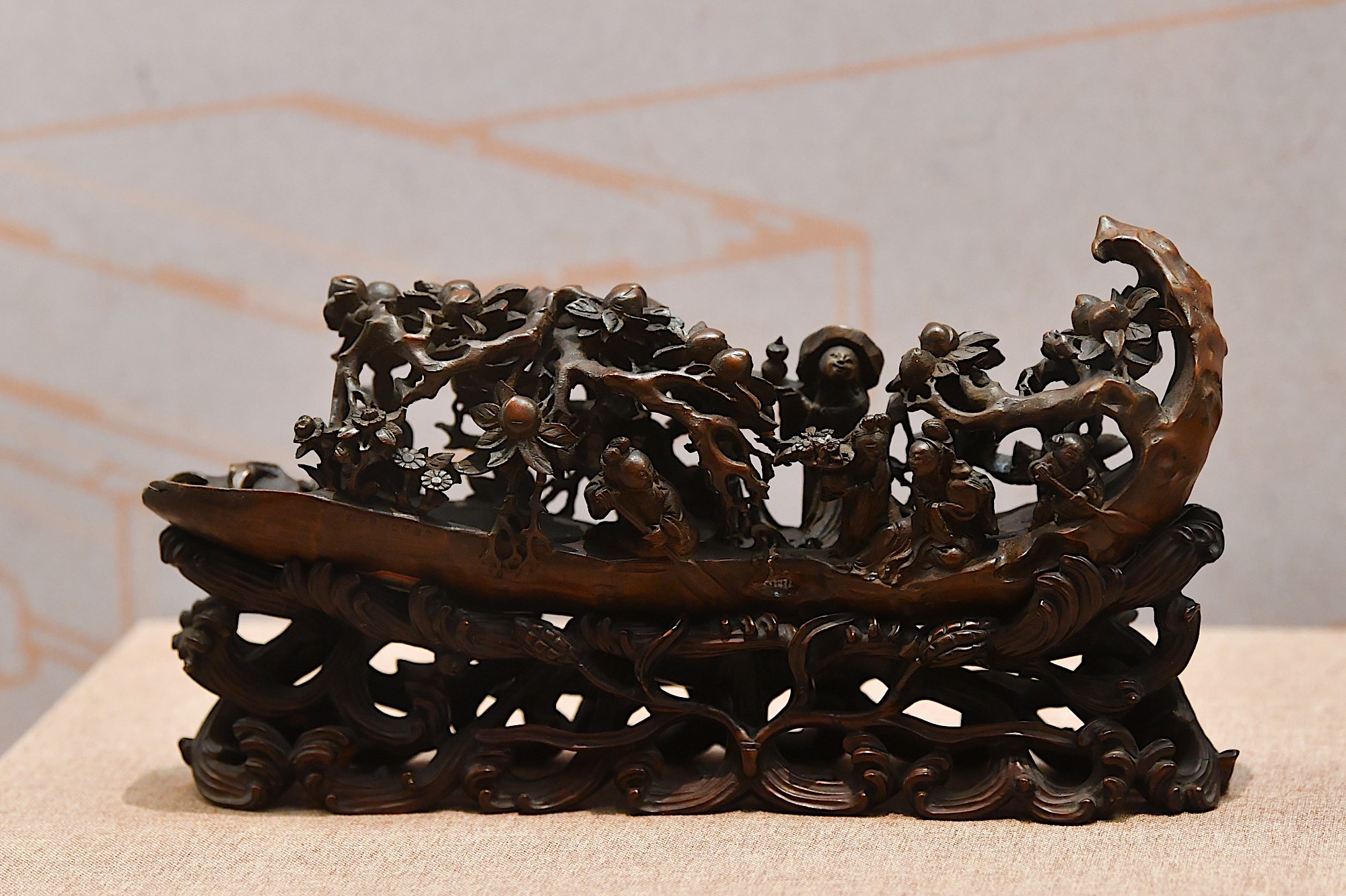文人七件宝,琴棋书画诗酒茶。对于明清时期的江南文人来说,饮酒品茶不仅是生活所需,更是寄托情趣、讲究礼仪的精神活动。他们注重茶器酒器的选择、环境和氛围,强调雅致和心境,而非单纯的感官享受。“茶酒斟酌”单元展出明镂雕花卉纹犀角杯、清乾隆青花缠枝花卉纹瓷茶船等雅致文物。无锡是紫砂壶的故乡,展览展出了清代陈曼生、邵大亨、杨彭年等制壶名家的作品。来自南京博物院的清仿古井栏紫砂壶设计极为精妙,造型灵感源自溧阳零陵寺唐代石井栏的优美弧线,由制壶名家陈曼生设计,杨彭年合作完成,凸显工艺与文人审美的交融。