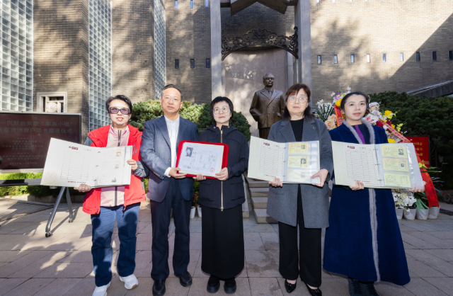 在梅园新村纪念馆周恩来总理雕像的见证下,南京市档案馆向吴石、陈宝仓、聂曦三位烈士后代赠送烈士及其家人的户籍卡仿真件,朱枫烈士的后人则获赠了两份珍贵的“上海市国民身份证声请书”影印件。这些由档案馆近期发现并精心复制的历史文档,清晰勾勒出吴石、聂曦、陈宝仓三位英烈当年在南京的生活轨迹,让跨越时空的追忆有了更为真切的凭依。
