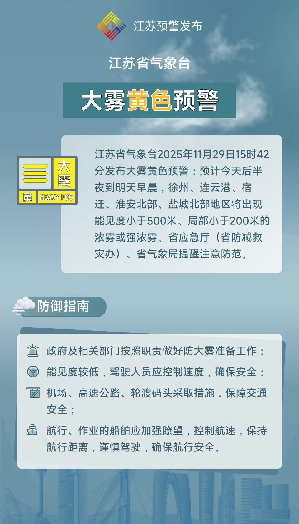 交汇点讯 11月29日15时42分,江苏省气象台发布大雾黄色预警,预计今天后半夜到明天早晨,徐州、连云港、宿迁、淮安北部、盐城北部地区将出现能见度小于500米、局部小于200米的浓雾或强浓雾,省应急厅(省防减救灾办)、省气象局提醒公众注意防范。