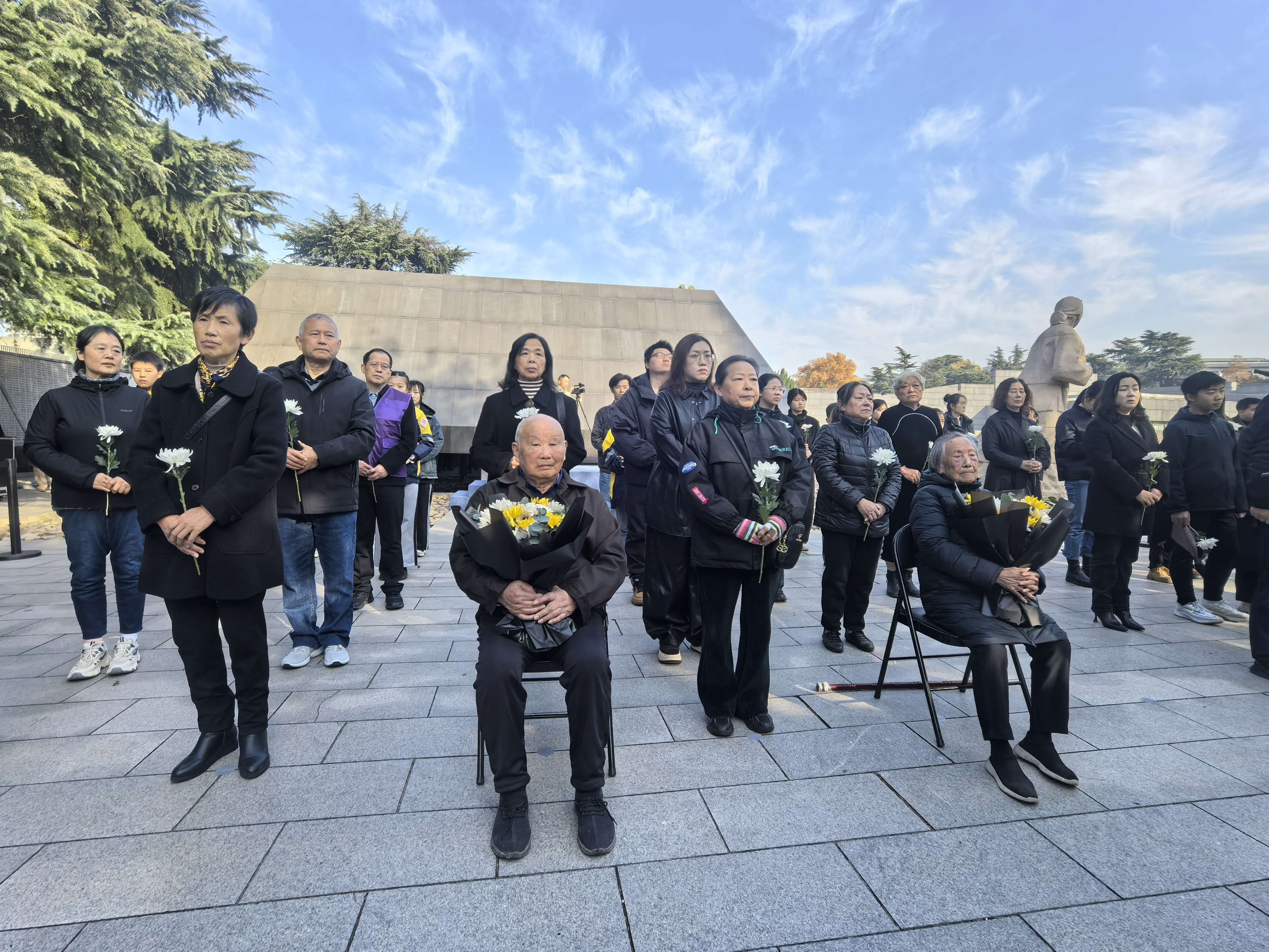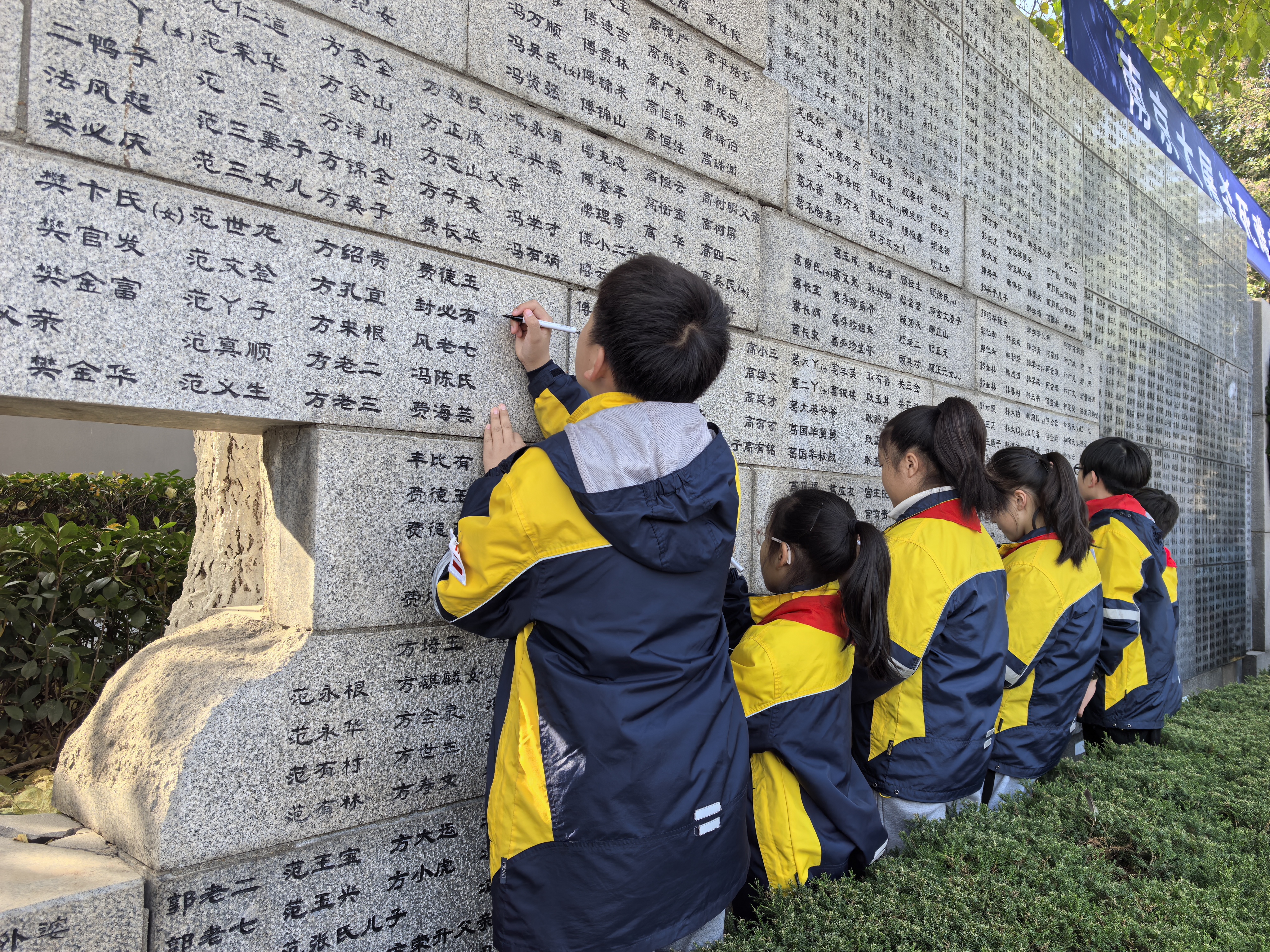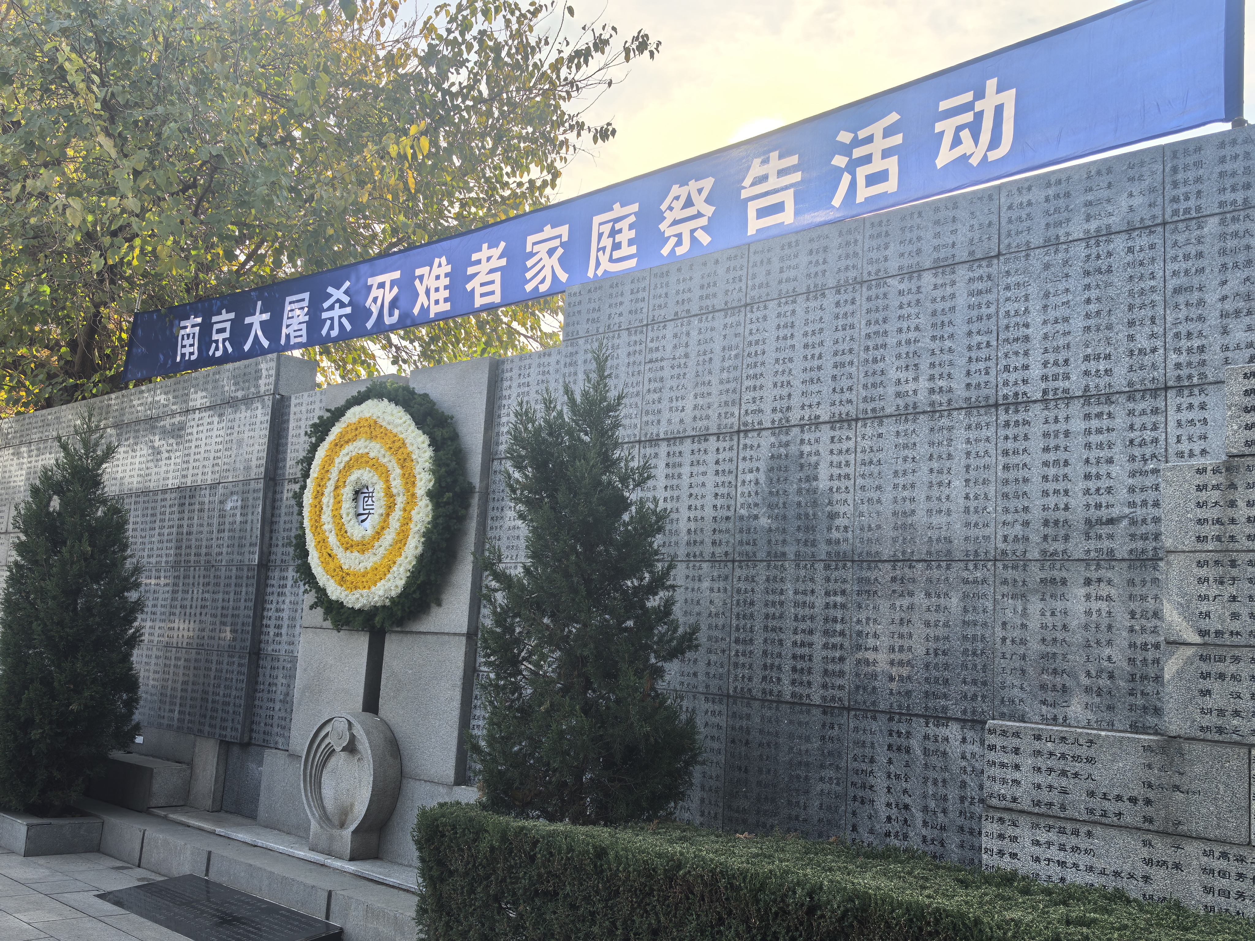 初冬的暖阳,斑驳地落在灰色的石墙上,黄白菊、松柏枝围就了一个大大的“奠”字,全体人员手持菊花向南京大屠杀死难者三鞠躬。幸存者后代代表、学生代表等为名单墙上的名字逐一“描新”。