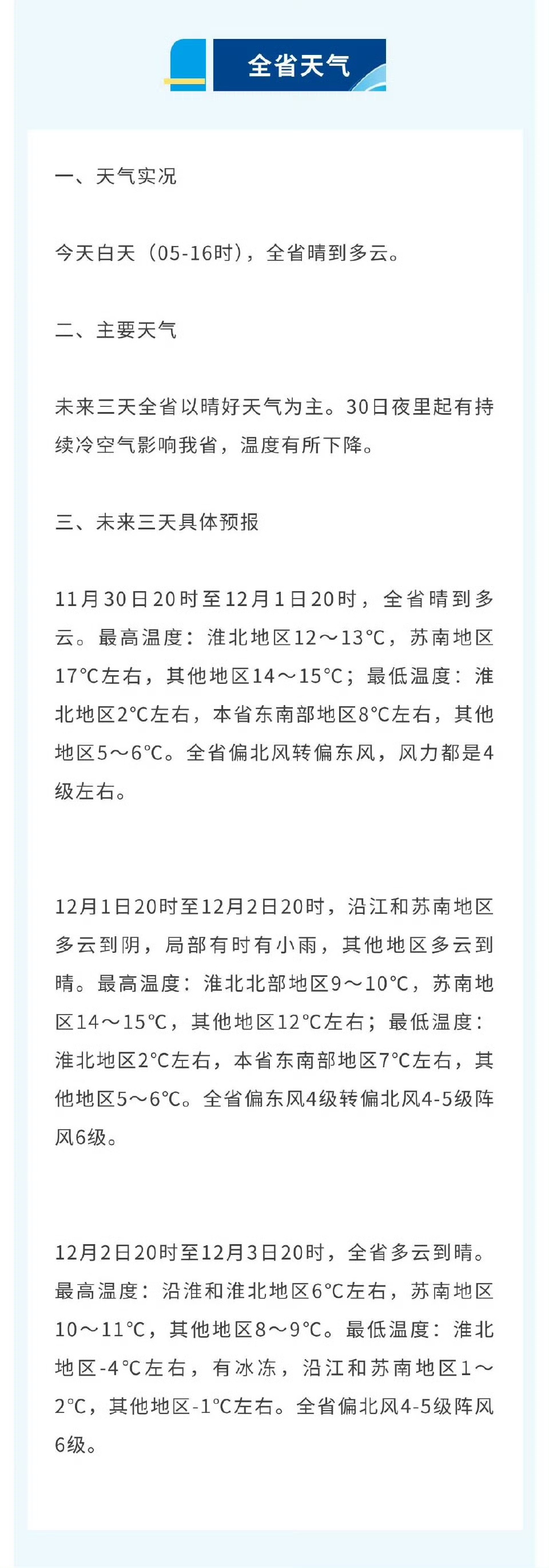 具体来看,未来三天江苏以晴好天气为主。11月30日夜里起有持续冷空气影响全省,温度有所下降。
