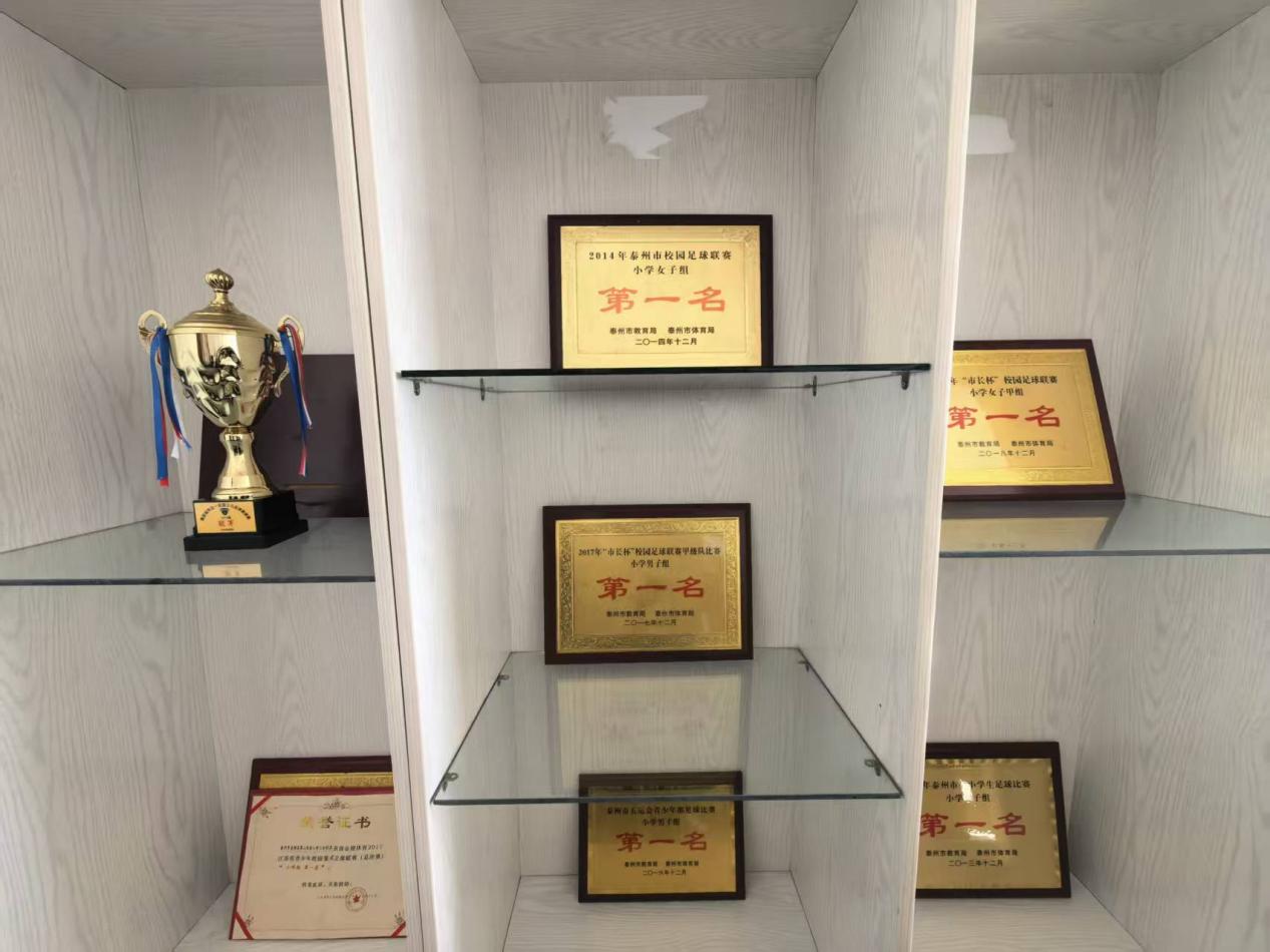 走进姜堰区淮海小学,球场上同样是一群稚嫩的面庞。8岁的小女孩颜睿皮肤晒得黝黑,奔跑起来像风一样。站在场边的泰州功勋教练俞建国满头银发,看着场上奔跑的身影,满眼尽是期待。走进学校足球荣誉室,各类奖牌、奖杯摆在展柜。