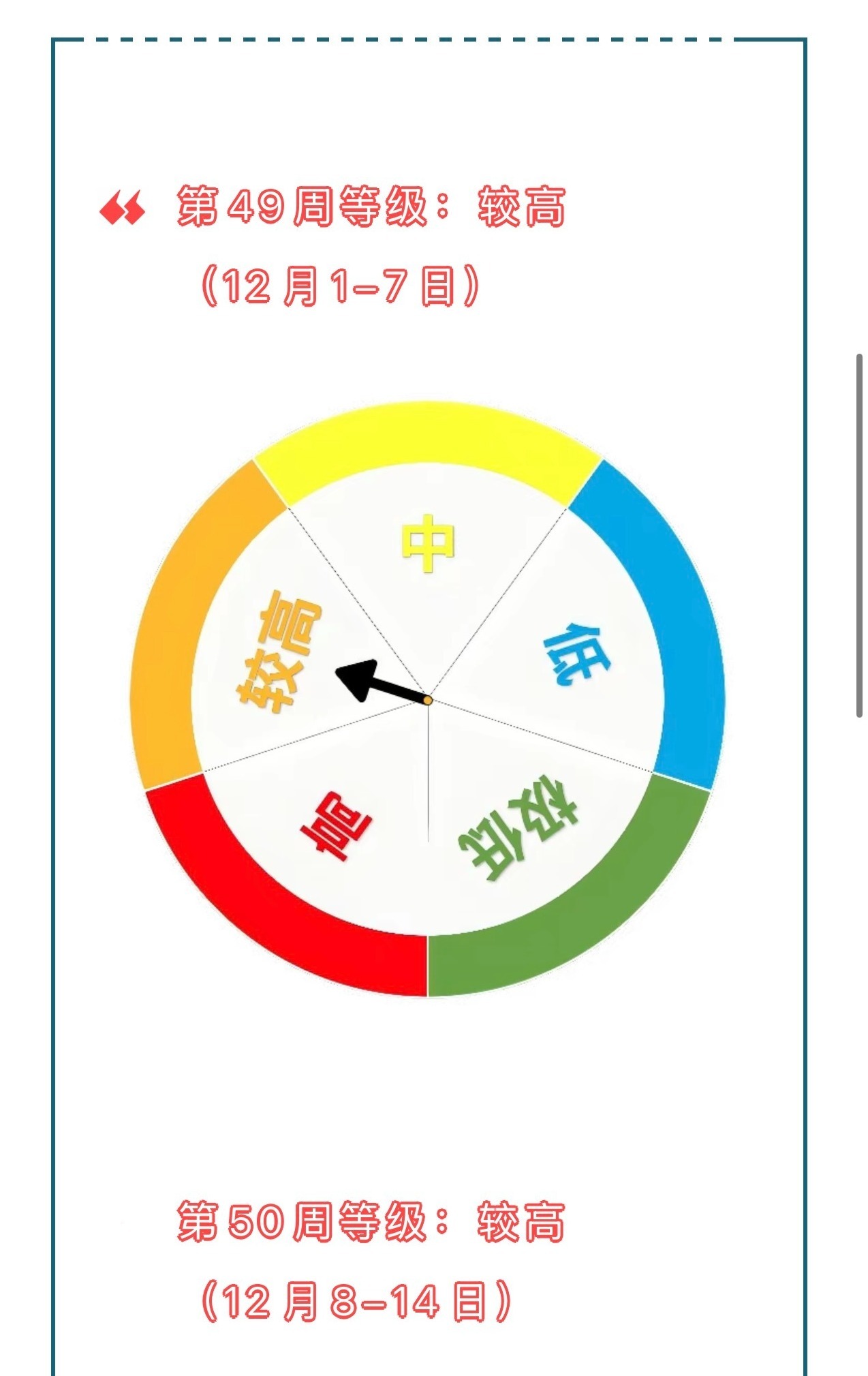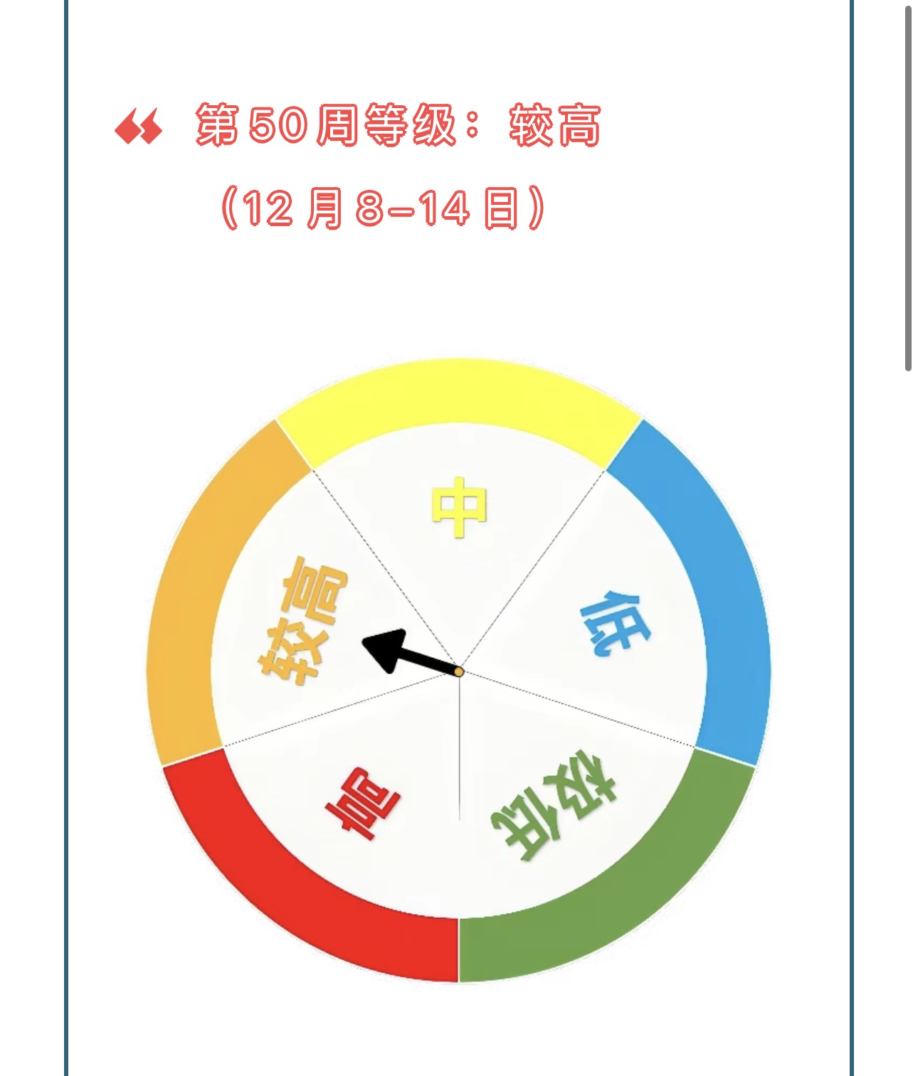 为做好防控,江苏省疾控中心联合省气象台,依托传统预测模型与人工智能模型集成算法,推出了流感气象指数预报服务,该服务在流感季每周发布,可预测当周及未来一周流感气象风险。最新预报显示,第49周(12月1—7日)和第50周(12月8—14日)江苏流感气象风险等级均为较高,对此也有针对性健康提示,公众需关注寒潮影响及时增减衣物,少去人员密集场所并做好防护,出现流感症状及时就医,同时建议积极接种流感疫苗降低感染风险。