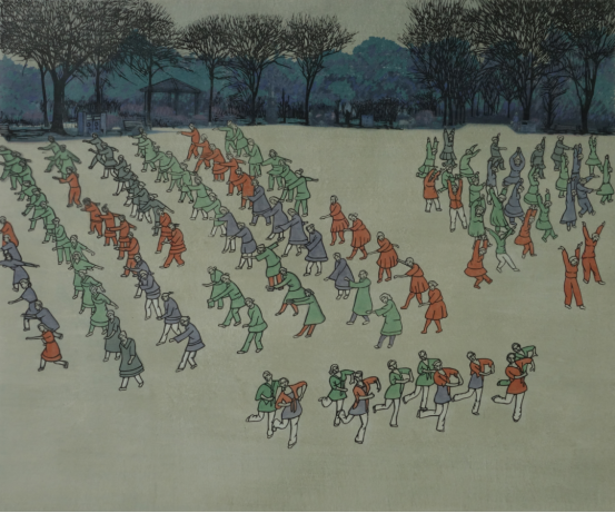 鲁迅曾以“镂象于木,印之素纸”精准概括中国水印木刻的精神根脉。江苏版画家们恪守正道、勇于创新,深植十竹斋饾版、桃花坞年画与徐州汉画像石的江南文脉,撷取传统水墨意趣与新兴木刻精神,开创了融水韵于刀味的艺术新境。展厅中,观众可以看到,在一代代创作者的不懈耕耘中,江苏水印木刻不仅从地域工艺跃升为当代艺术语言,更让“水印美学”在时光流转中沉淀为隽永的岁月清晖。
