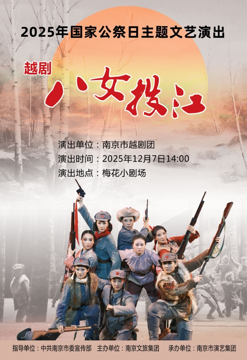 12月7日,由南京市越剧团创作的越剧《八女投江》将在梅花小剧场上演。该剧创作于2015年,是南京市越剧团为纪念抗日战争胜利70周年创排推出的作品,曾先后荣获第三届江苏省文华奖“优秀剧目奖”、第七届南京市文学艺术奖“优秀作品奖”等奖项。