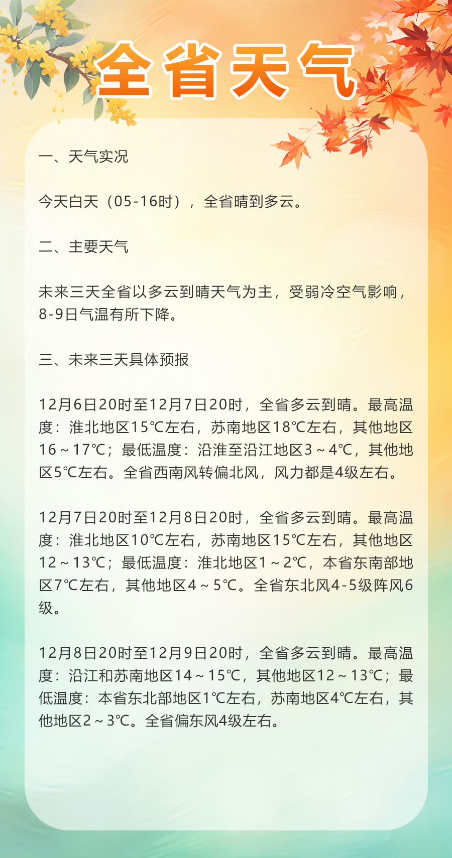 未来三天江苏以多云到晴天气为主,受弱冷空气影响,8日至9日气温有所下降。12月6日20时至12月7日20时,全省多云到晴,最高温度淮北地区15℃左右,苏南地区18℃左右,其他地区16~17℃,最低温度沿淮至沿江地区3~4℃,其他地区5℃左右,全省西南风转偏北风,风力均为4级左右;12月7日20时至12月8日20时,全省多云到晴,最高温度淮北地区10℃左右,苏南地区15℃左右,其他地区12~13℃,最低温度淮北地区1~2℃,本省东南部地区7℃左右,其他地区4~5℃,全省东北风4~5级阵风6级;12月8日20时至12月9日20时,全省多云到晴,最高温度沿江和苏南地区14~15℃,其他地区12~13℃,最低温度本省东北部地区1℃左右,苏南地区4℃左右,其他地区2~3℃,全省偏东风4级左右。