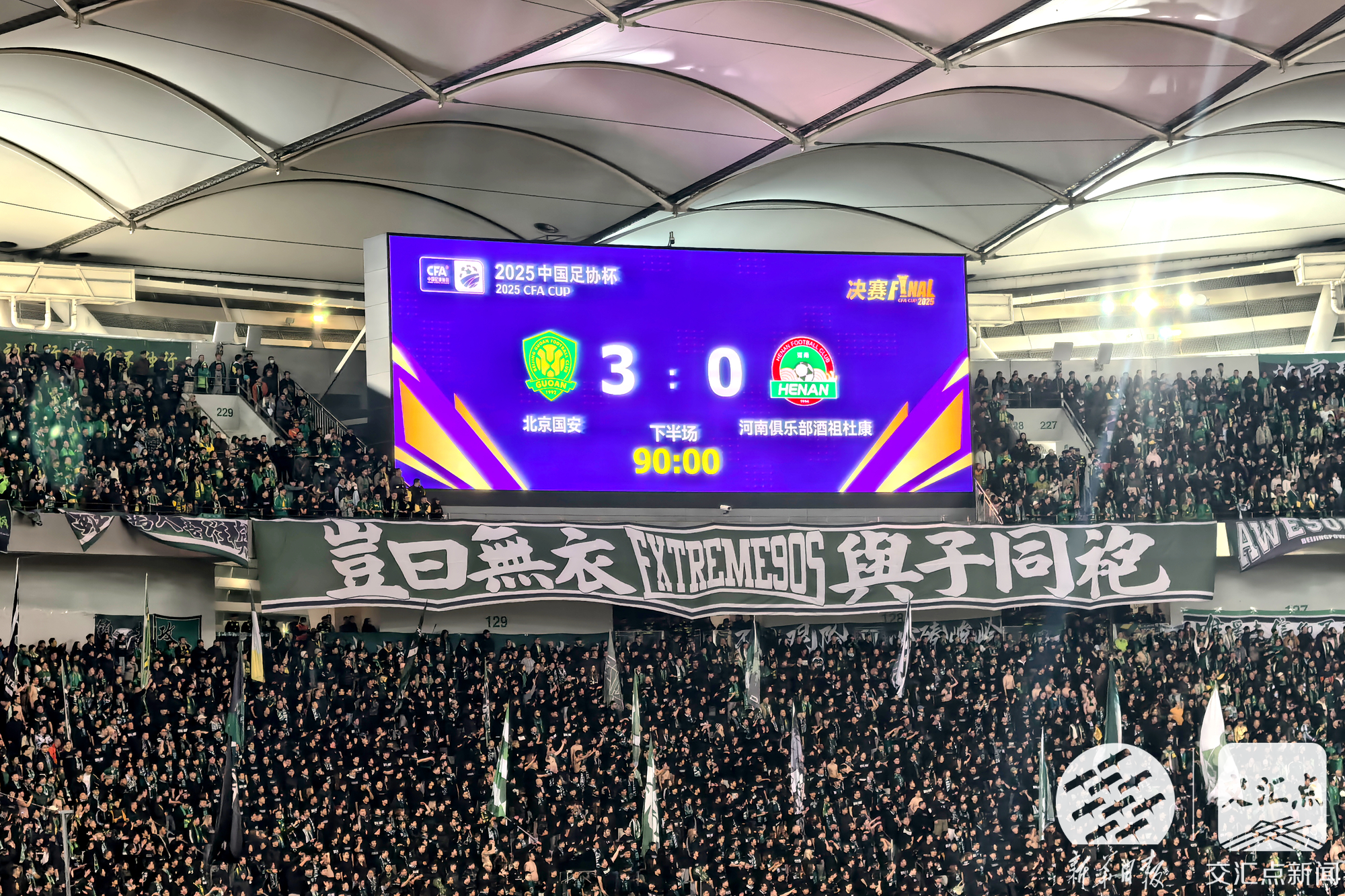 交汇点讯 12月6日晚7时,2025中国足球协会杯决赛在苏州奥体中心体育场打响。经过90分钟激战,北京国安队3:0战胜河南队,赢得2025年足协杯冠军。现场,超4万名球迷共同见证了这场扣人心弦的“京豫对决”。