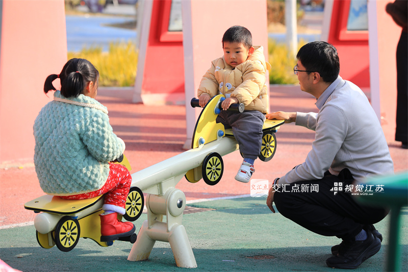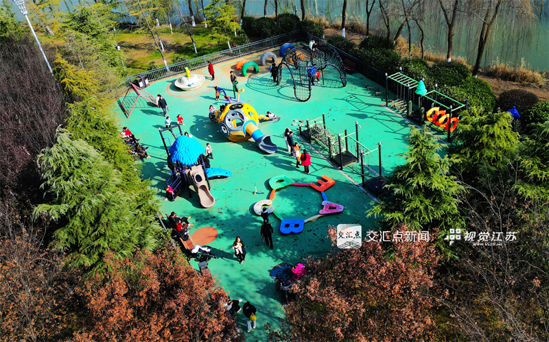 12月7日,泗阳县,市民带着孩子在口袋公园内沐浴暖阳、休闲嬉戏,方寸绿地尽显惬意。徐国权 摄 视觉江苏网供图