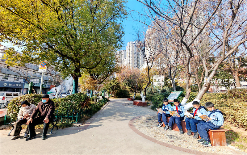 12月8日,与徐州市民主路小学校一墙之隔的黄楼文化口袋公园,成为孩子们午后读书、候学的好去处。安炳力 摄 视觉江苏网供图