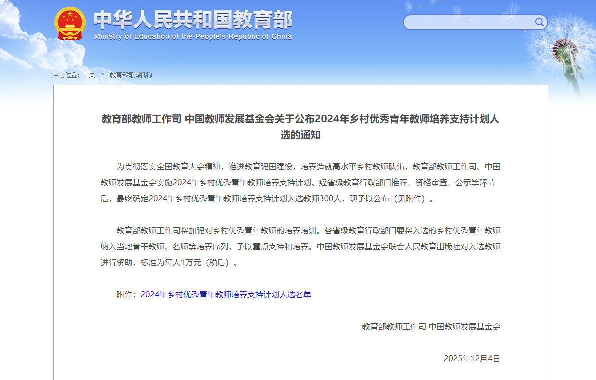另据教育部此前出台的相关文件,实施乡村优秀青年教师培养支持计划(原乡村优秀青年教师培养奖励计划)的目的,在于强化对乡村优秀青年教师的培养发展和激励支持,促进专业成长,发挥示范引领作用,辐射带动乡村教师队伍整体素质提升,推进乡村教育事业持续健康发展。