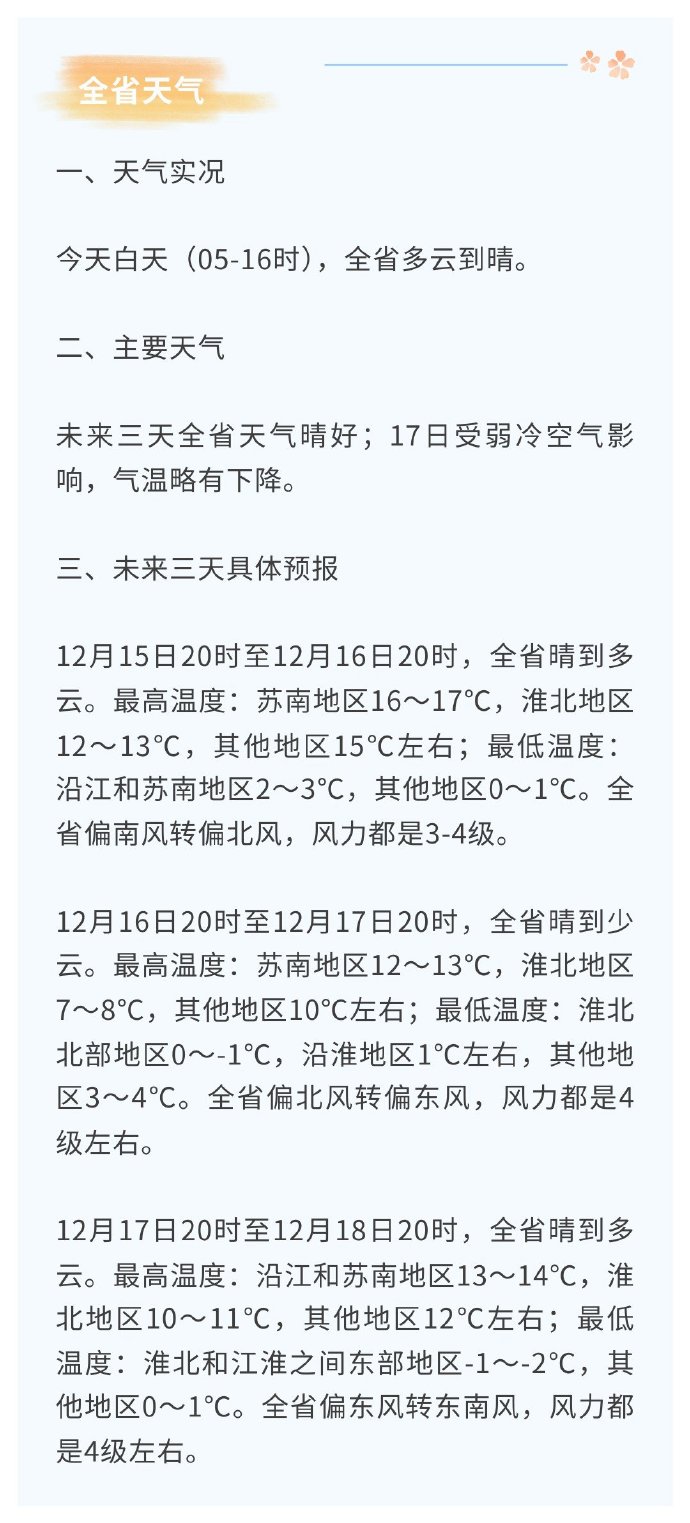 具体天气预报如下:12月15日20时至12月16日20时,全省晴到多云,最高温度苏南地区16~17℃,淮北地区12~13℃,其他地区15℃左右;最低温度沿江和苏南地区2~3℃,其他地区0~1℃,全省偏南风转偏北风,风力3~4级。12月16日20时至12月17日20时,全省晴到少云,最高温度苏南地区12~13℃,淮北地区7~8℃,其他地区10℃左右;最低温度淮北北部地区0~-1℃,沿淮地区1℃左右,其他地区3~4℃,全省偏北风转偏东风,风力4级左右。12月17日20时至12月18日20时,全省晴到多云,最高温度沿江和苏南地区13~14℃,淮北地区10~11℃,其他地区12℃左右;最低温度淮北和江淮之间东部地区-1~-2℃,其他地区0~1℃,全省偏东风转东南风,风力4级左右。