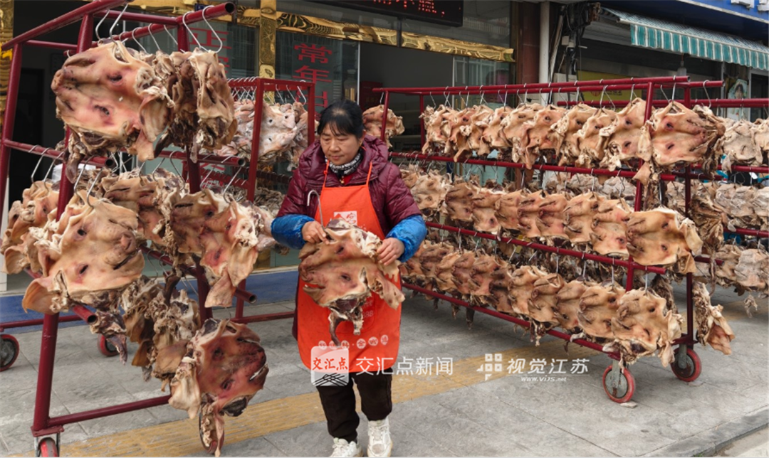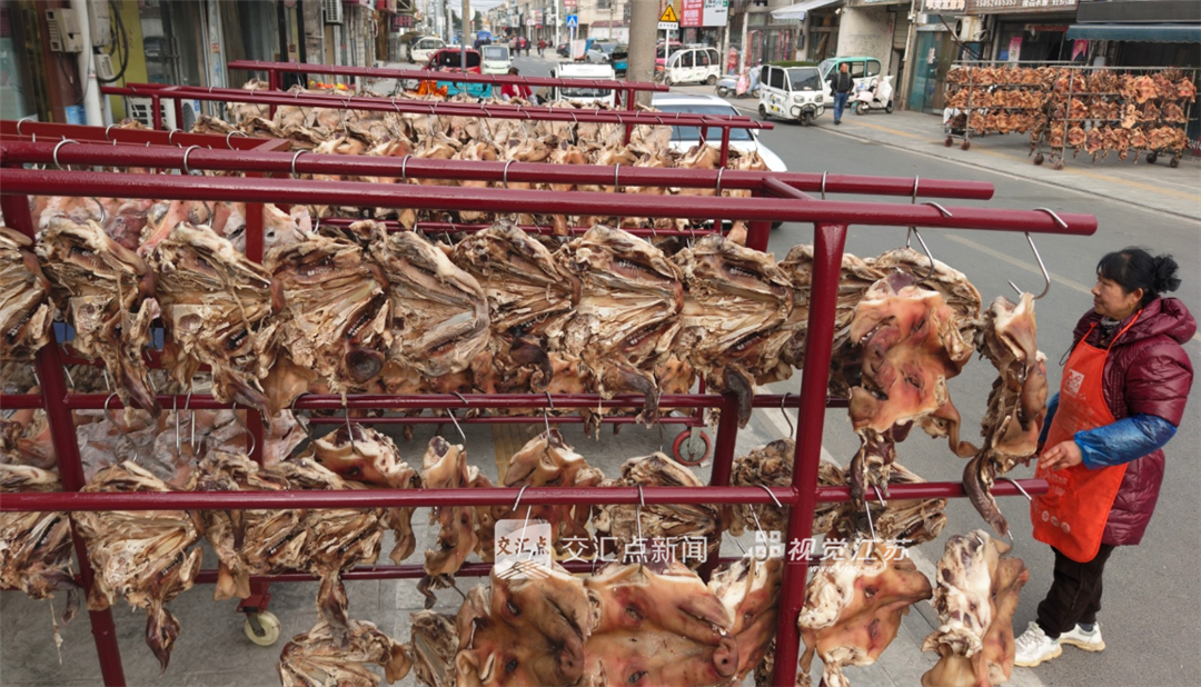 (特约摄影 王东 11:59摄 14:09上线)12月20日,淮安市淮安区季桥镇街头,多家商户正在楼顶、门店前晾晒咸猪头、咸鸭等咸货,吸引消费者选购。作为淮扬菜系代表之一,季桥咸猪头通过淮安美食文化节推广后知名度显著提升,已成为特色地方美食。