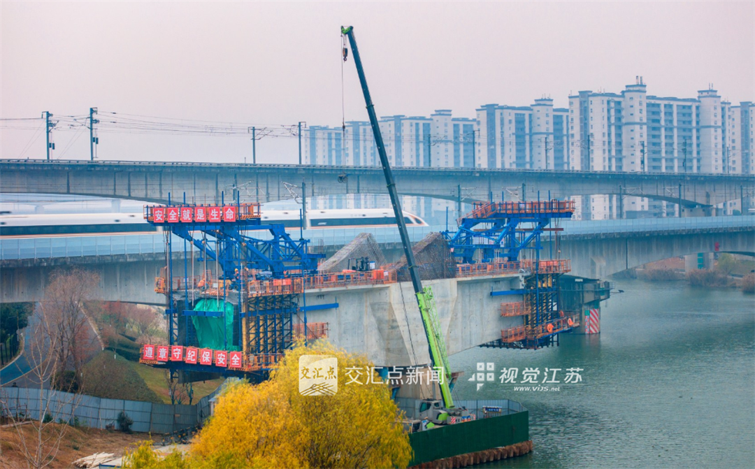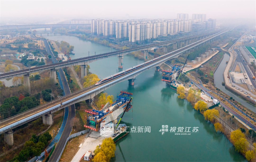 (特约摄影 张明伟 08:20摄 13:48上线)12月20日,南京市秦淮区,一列高铁穿过建设中的宁芜铁路扩能改造工程秦淮河特大桥施工现场。