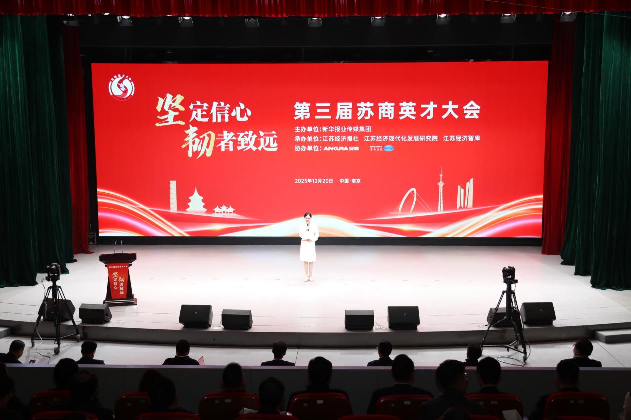 12月20日,由新华报业传媒集团主办,江苏经济报社、江苏经济现代化发展研究院、江苏经济智库联合承办,江苏安靠智电股份有限公司、江苏吴中集团有限公司协办的第三届苏商英才大会在南京成功举办。民建中央副主席、江苏省政协副主席、民建江苏省委会主委洪慧民;新华日报社党委书记、社长,新华报业传媒集团董事长双传学出席会议并致辞。现场同步发布“2025年度江苏十大经济新闻”、“2025年度江苏十大经济新闻人物”、“2025年度金麒麟奖”三项重磅榜单。