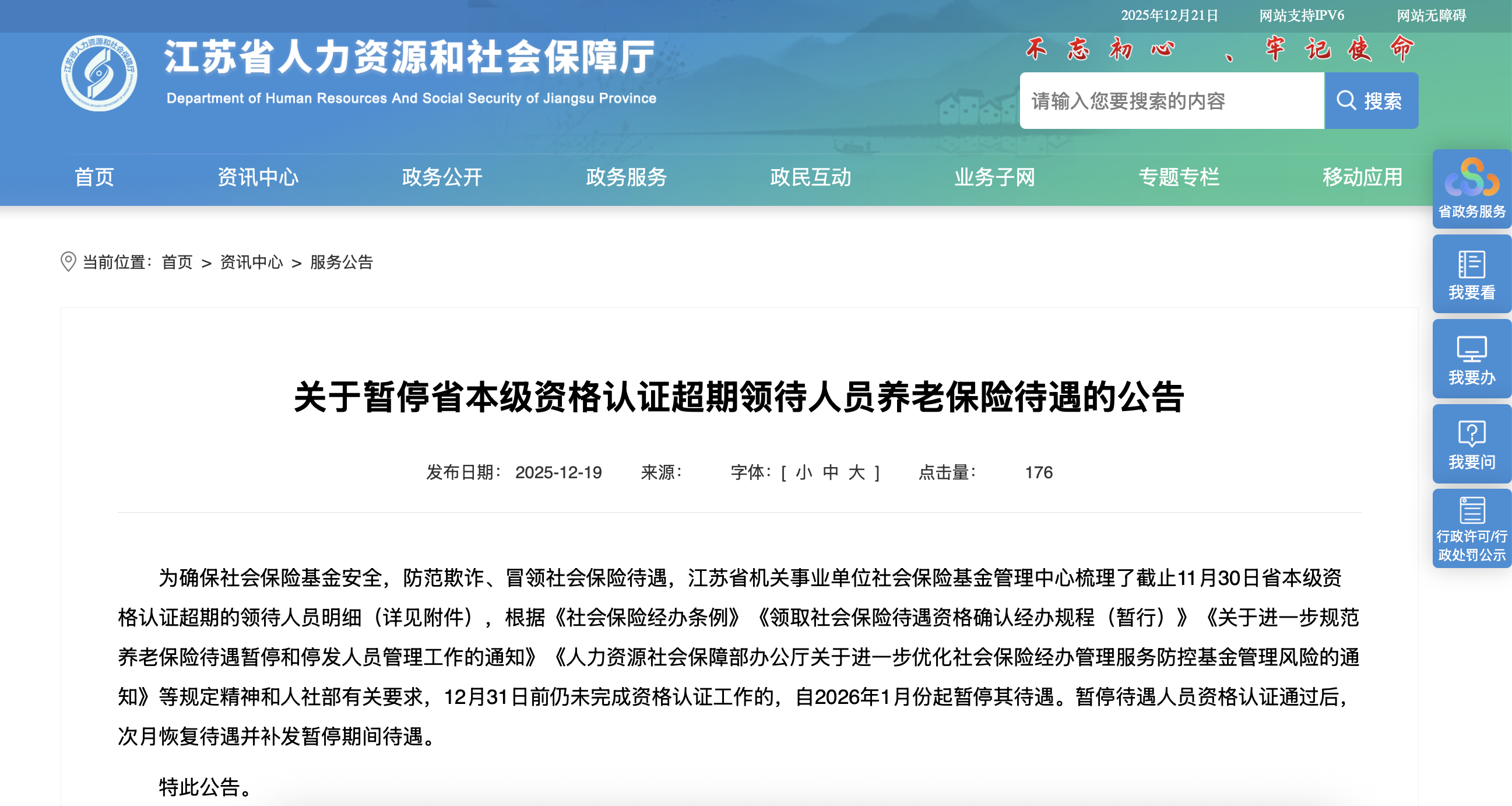 交汇点讯 江苏省人社厅近日在官网公布将暂停2766位省本级资格认证超期领待人员养老保险待遇的公告。这些人员如果在12月31日前仍未完成资格认证工作,2026年1月起将被暂停发放待遇。