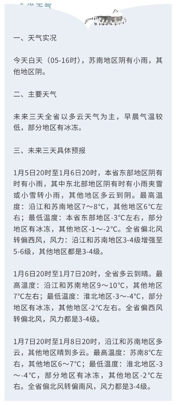 未来三天具体天气预报如下:1月5日20时至1月6日20时,本省东部地区阴有时有小雨,其中东北部地区阴有时有小雨夹雪或小雪转小雨,其他地区多云到阴。最高温度:沿江和苏南地区7~8℃,其他地区6℃左右;最低温度:本省东部地区-3℃左右,部分地区有冰冻,其他地区-1~-2℃。全省偏北风转偏西风,风力:沿江和苏南地区3~4级增强至5~6级,其他地区都是3—4级。1月6日20时至1月7日20时,全省多云到晴。最高温度:沿江和苏南地区9~10℃,其他地区7℃左右;最低温度:淮北地区-3~-4℃,部分地区有冰冻,其他地区-2℃左右。全省偏西风转偏北风,风力都是3~4级。1月7日20时至1月8日20时,沿江和苏南地区多云,其他地区晴到多云。最高温度:苏南8℃左右,其他地区6~7℃;最低温度:淮北地区-3~-4℃,部分地区有冰冻,其他地区-2℃左右。全省偏北风转偏南风,风力都是3~4级。